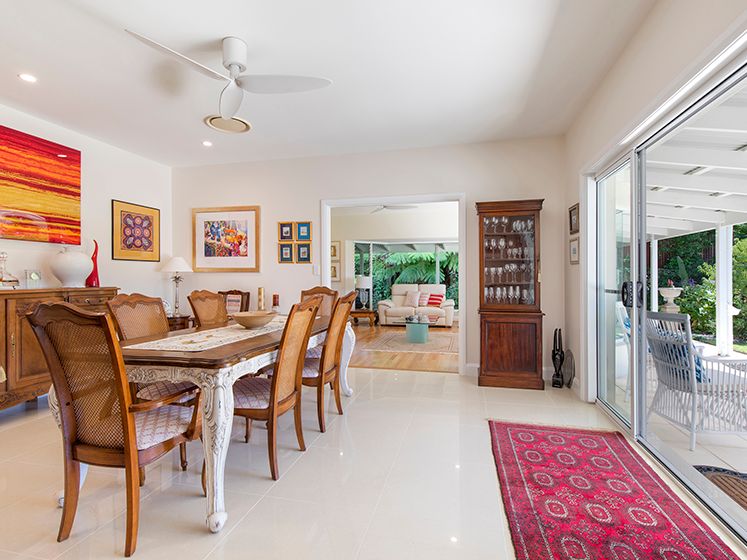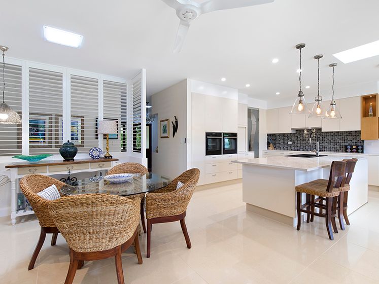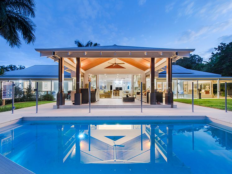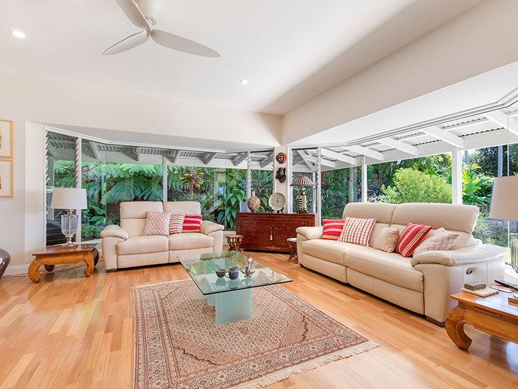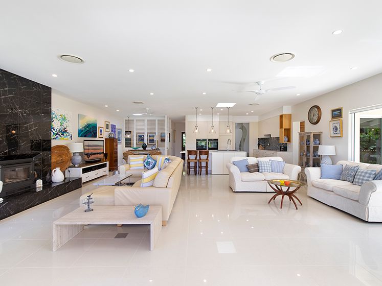 There are several living areas including a large open living room with a stunning fireplace, separate dining and a lounge/media room with floor to ceiling mitred glass framing the outside tropical foliage.