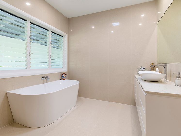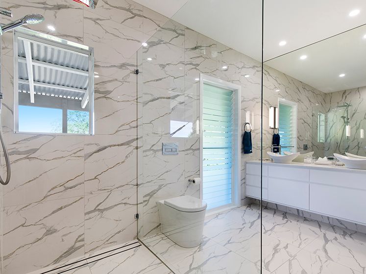 The bathrooms have been beautifully renovated with natural tones in stone.
