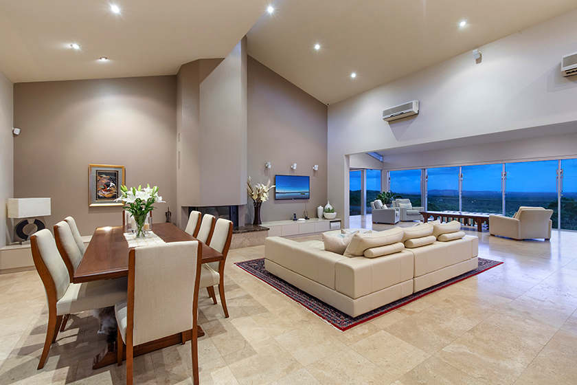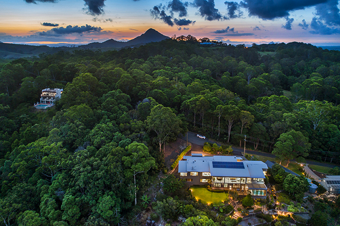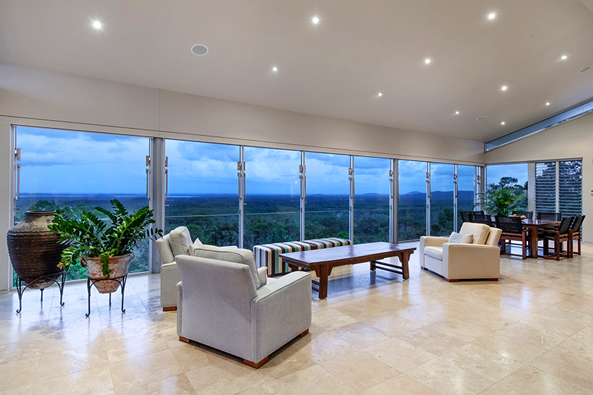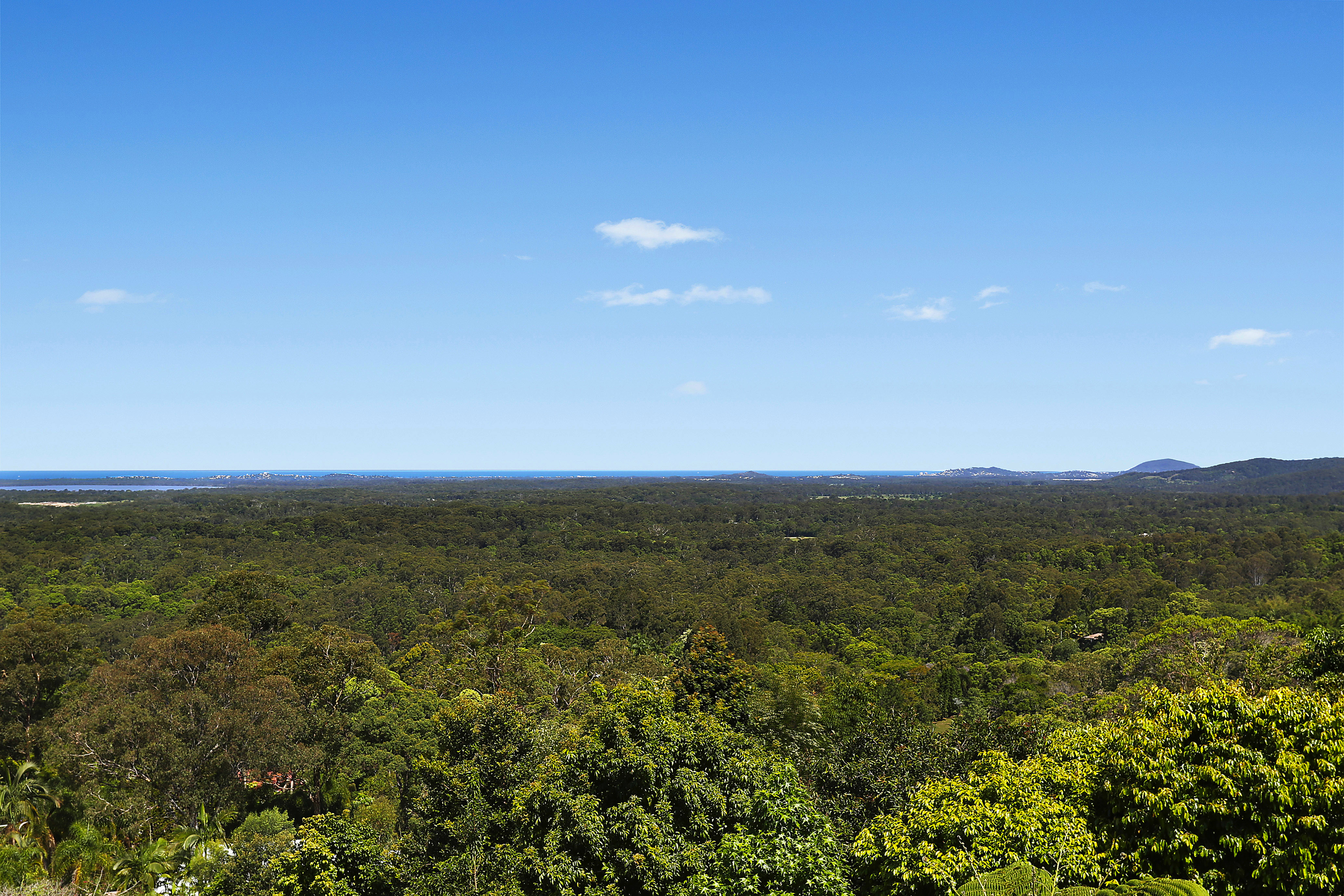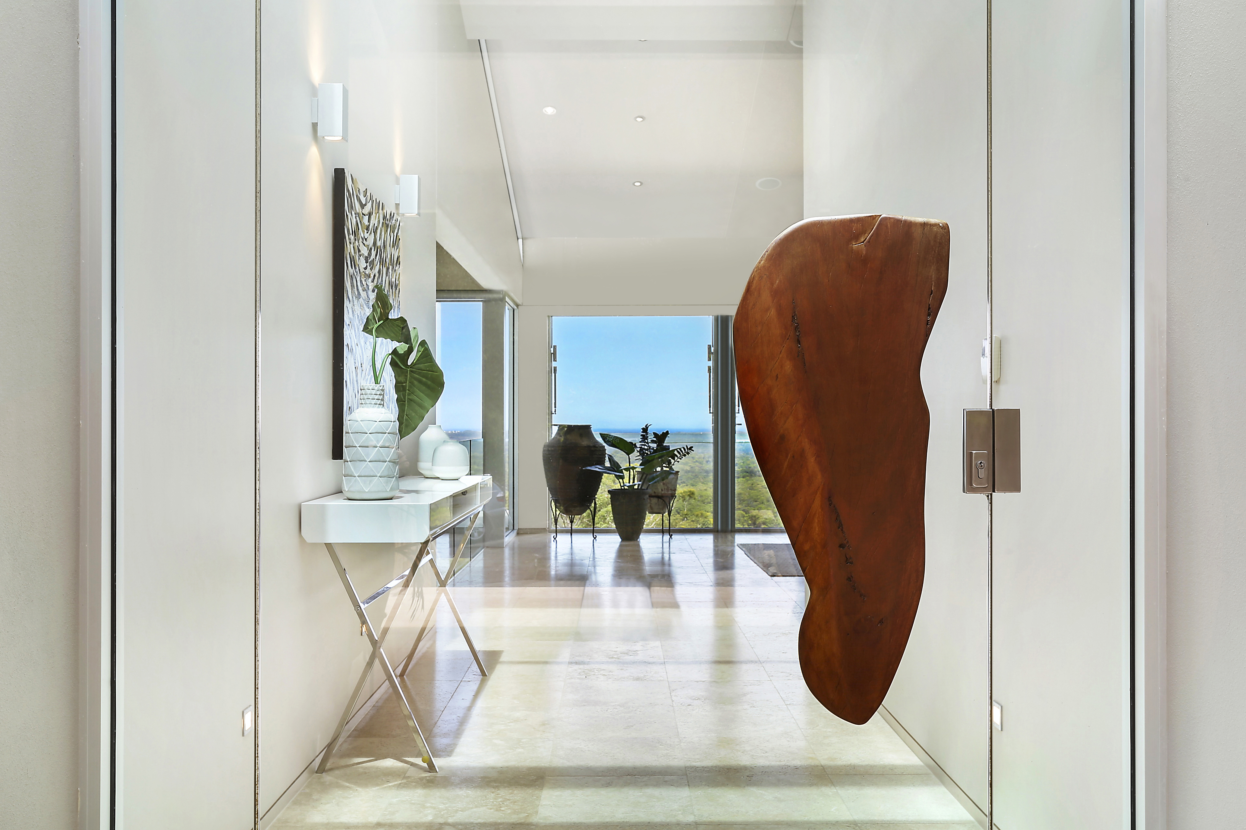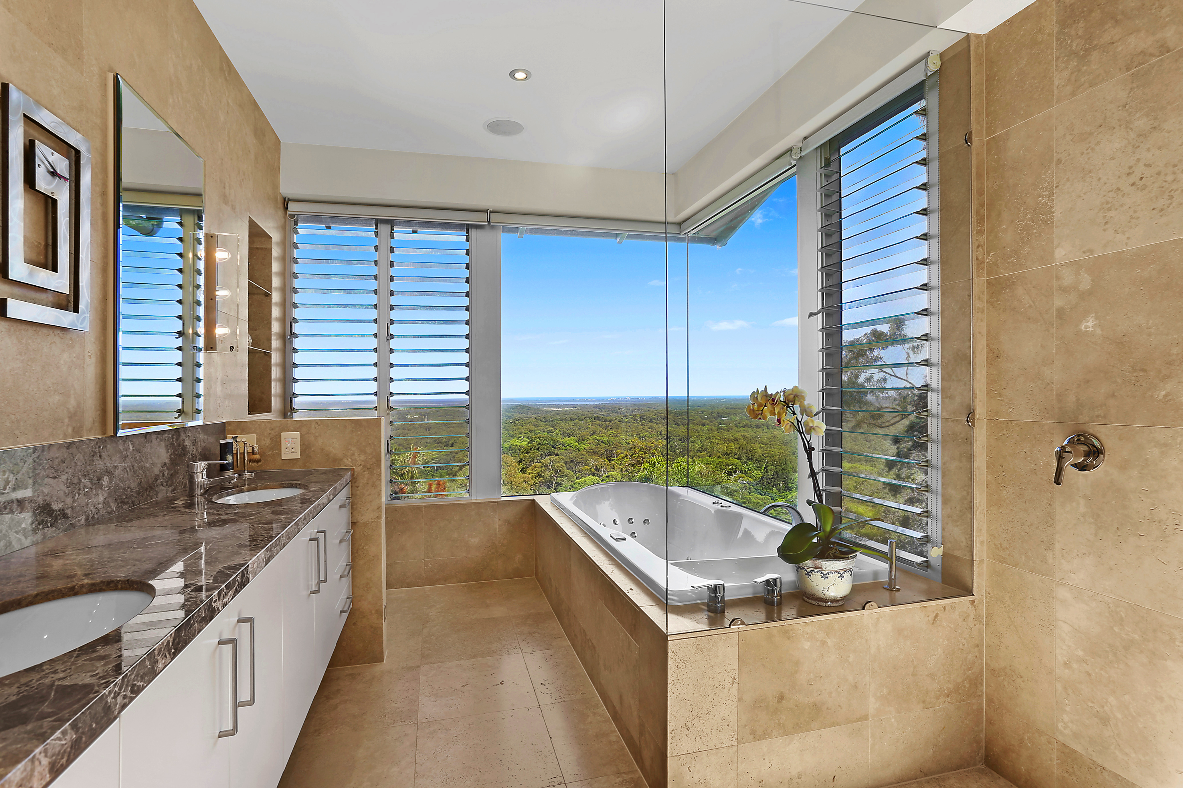 At the very top of exclusive Tinbeerwah, with incredible panoramic views taking in Noosa Heads to Coolum Beach and the ocean beyond, this opulent home will inspire and impress. Built to the highest standards with quality travertine floors, high ceilings and extensive use of feature glass, relish in light filled luxury as the glorious views are drawn inside. Easy circular driveway access leads to a pivoting glass front entry door where the journey begins. Neutral tones and clean lines are the norm and your eyes are drawn to an expansive full height glass wall which showcases the green and blue panorama.