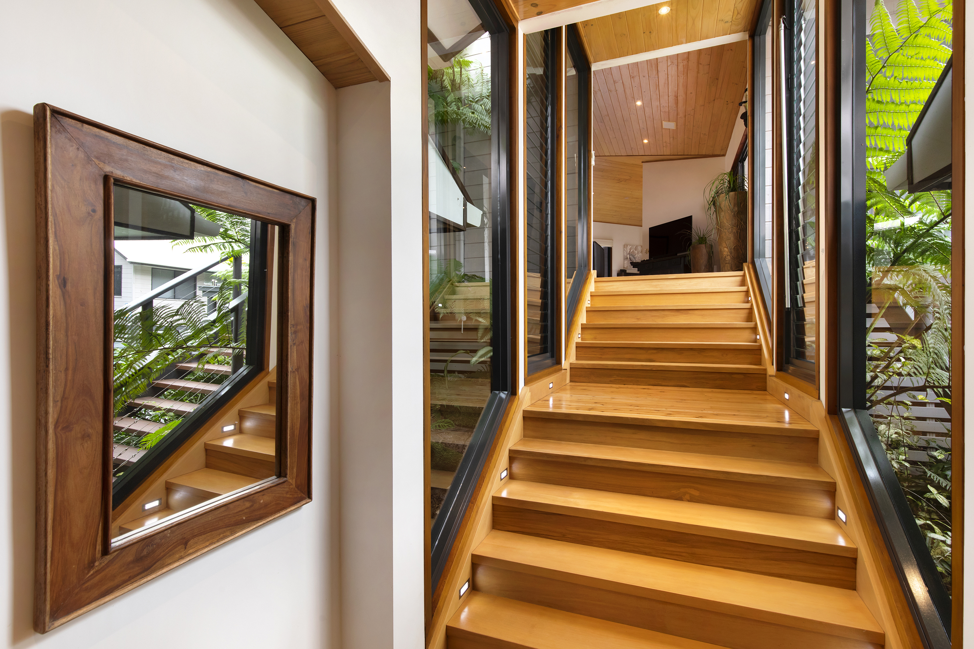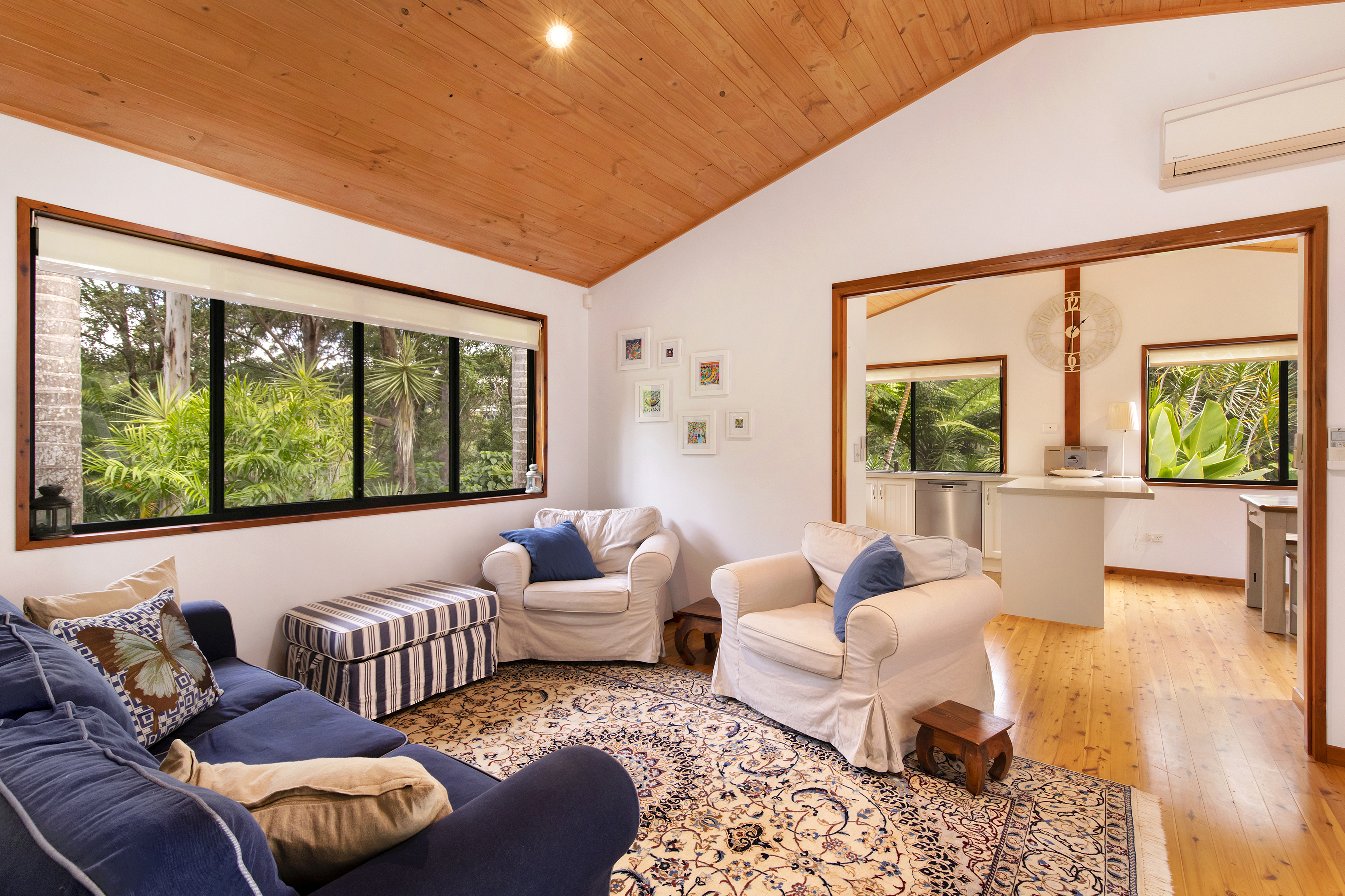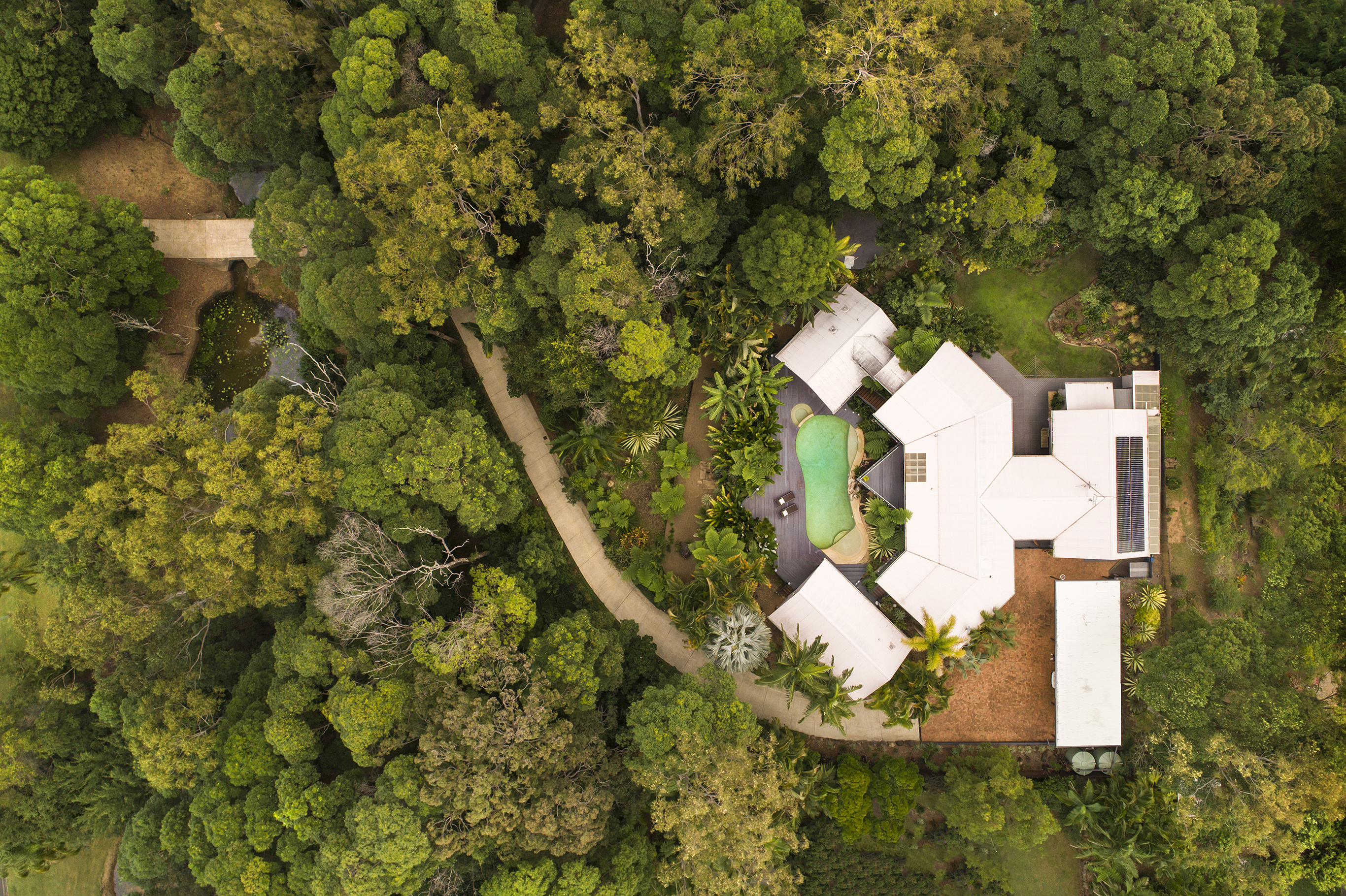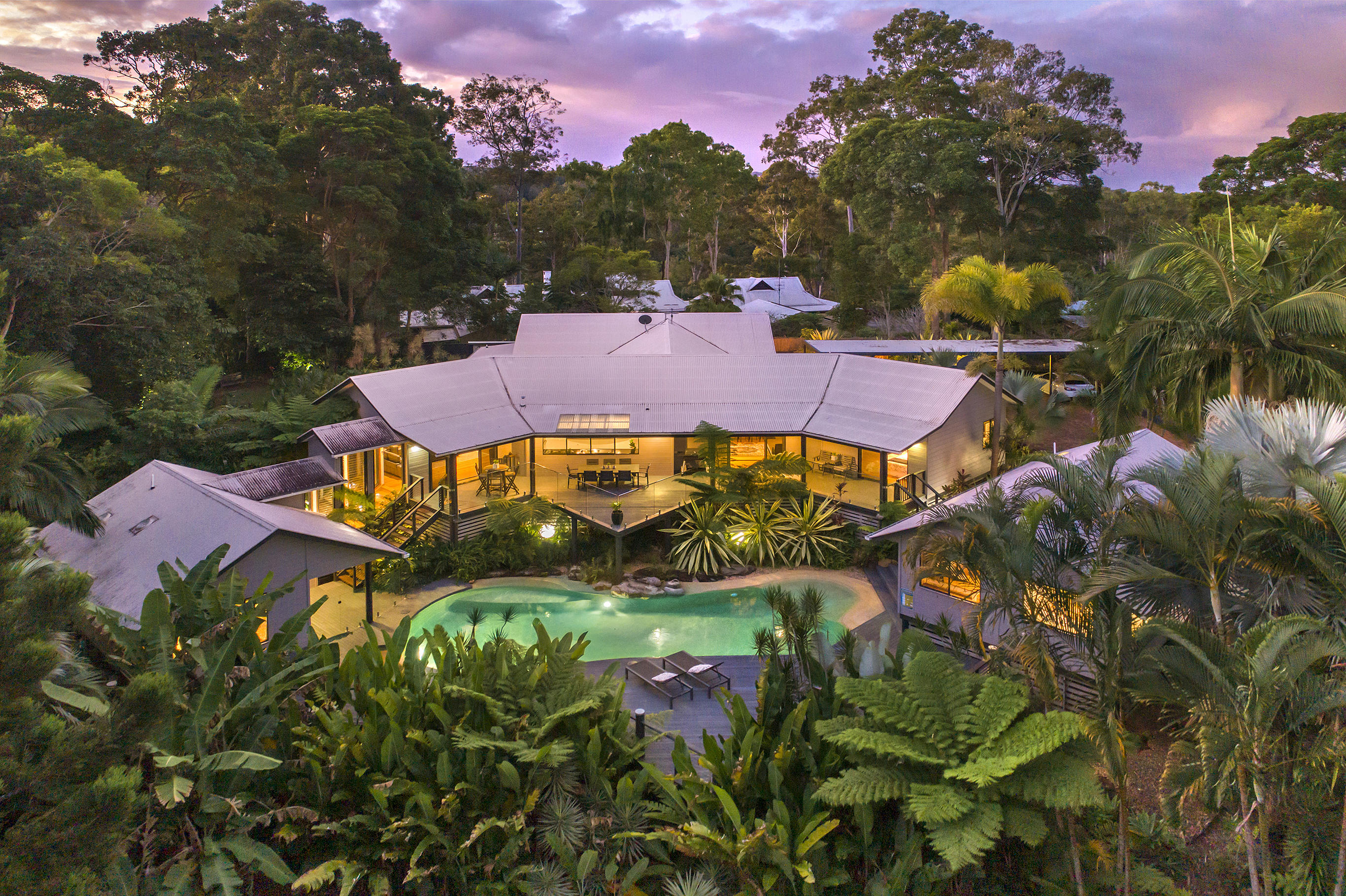 An adjacent self-contained pavilion offers a brand new large chef's kitchen including a Miele dishwasher. Both the kitchen and adjoining dining areas offer breathtaking views to the garden and pool. Surrounded by palms is one gorgeous bedroom with bathroom and separate toilet. The lounge room opens to the entry with its own covered sitting area to take in the idyllic pool views. Perfect for live-in grandparents, B and B, or holiday letting. All pavilions have newly polished rich timber floors enhanced by timber cathedral ceilings, walls of windows and glass doors to fully appreciate the views of the forest and splendid tropical gardens. A covered breezeway, an additional alfresco area, leads to a huge studio with white soaring exposed beams and extensive lighting. It has its own powder room and large storage area. Perfect for an artist or any type of home business. A brand new carport to accommodate 5 cars completes the perfect picture. The Under Roof Area is in excess of 600 sq m.