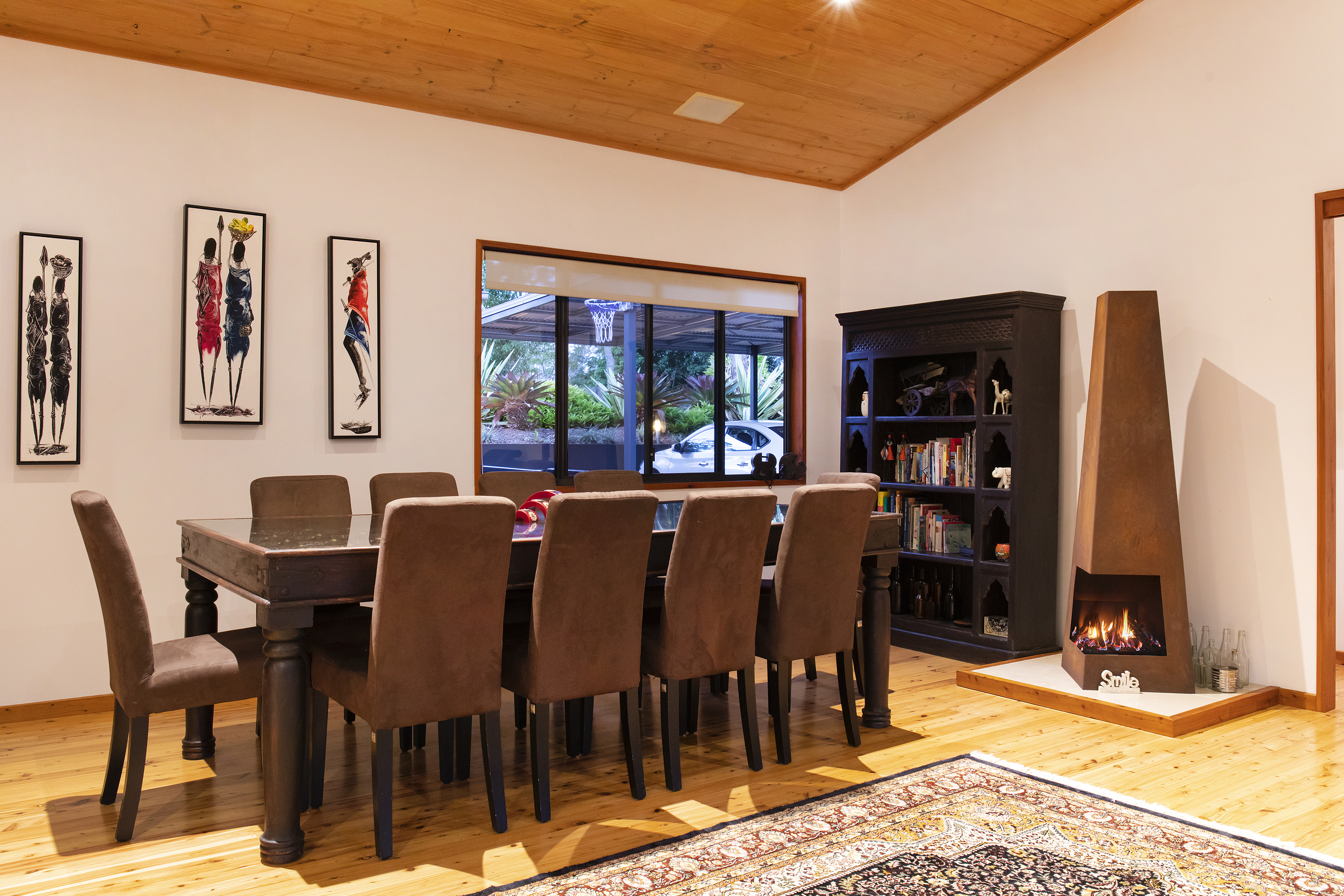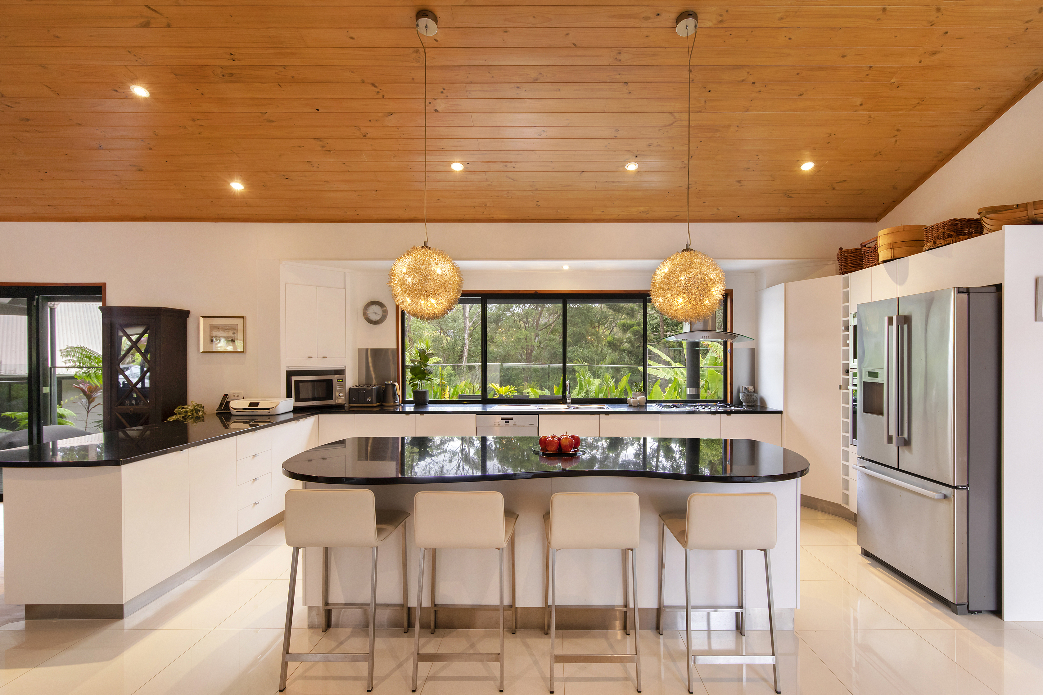 The main home with interconnecting living areas hosts in the centre a state-of-the-art kitchen with Miele and Neff appliances incorporating a steam oven inclusive a built-in coffee bar, perfect for the coffee connoisseur! On either side there is a huge lounge room and dining/lounge with an open fire that adds to the ambience.