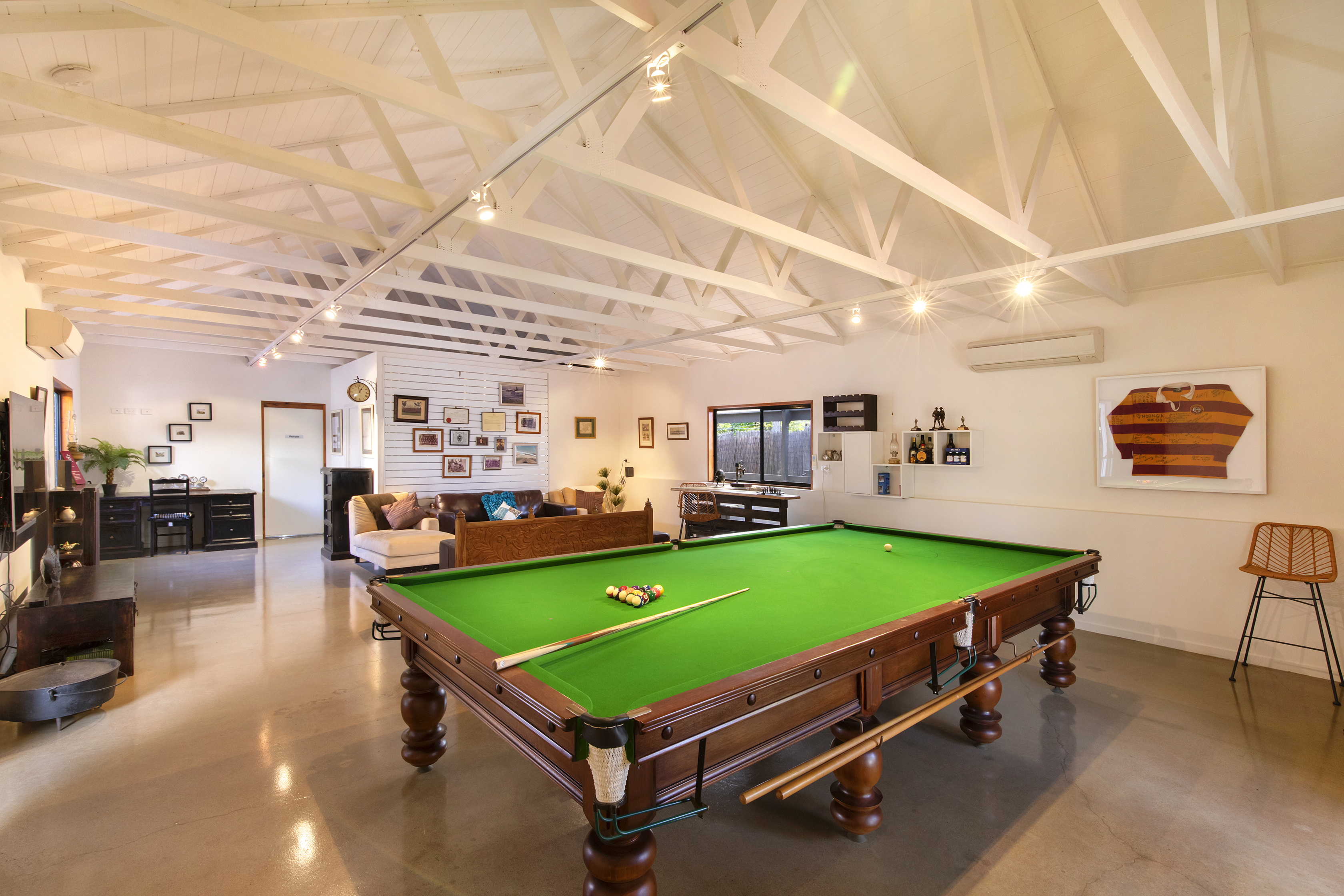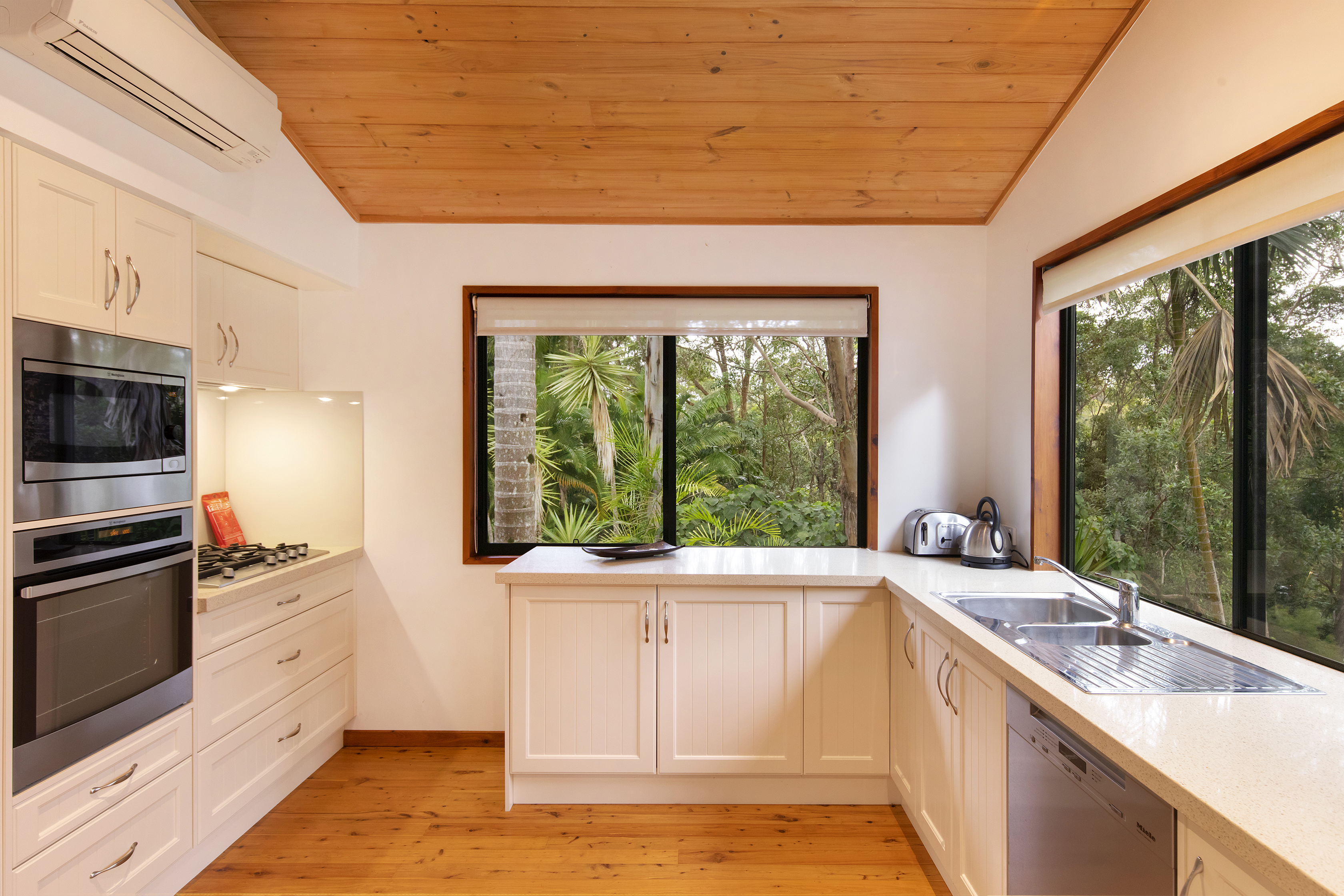 INSIDE FEATURES: . 4 Plus bedrooms . 3 bathrooms plus powder room . Large chef kitchens inc. dishwashers . Huge studio . All rooms split system air conditioning . Plus ceiling fans . 3 Meter plus raked timber ceilings . Newly polished timber flooring . Electronic security system throughout
