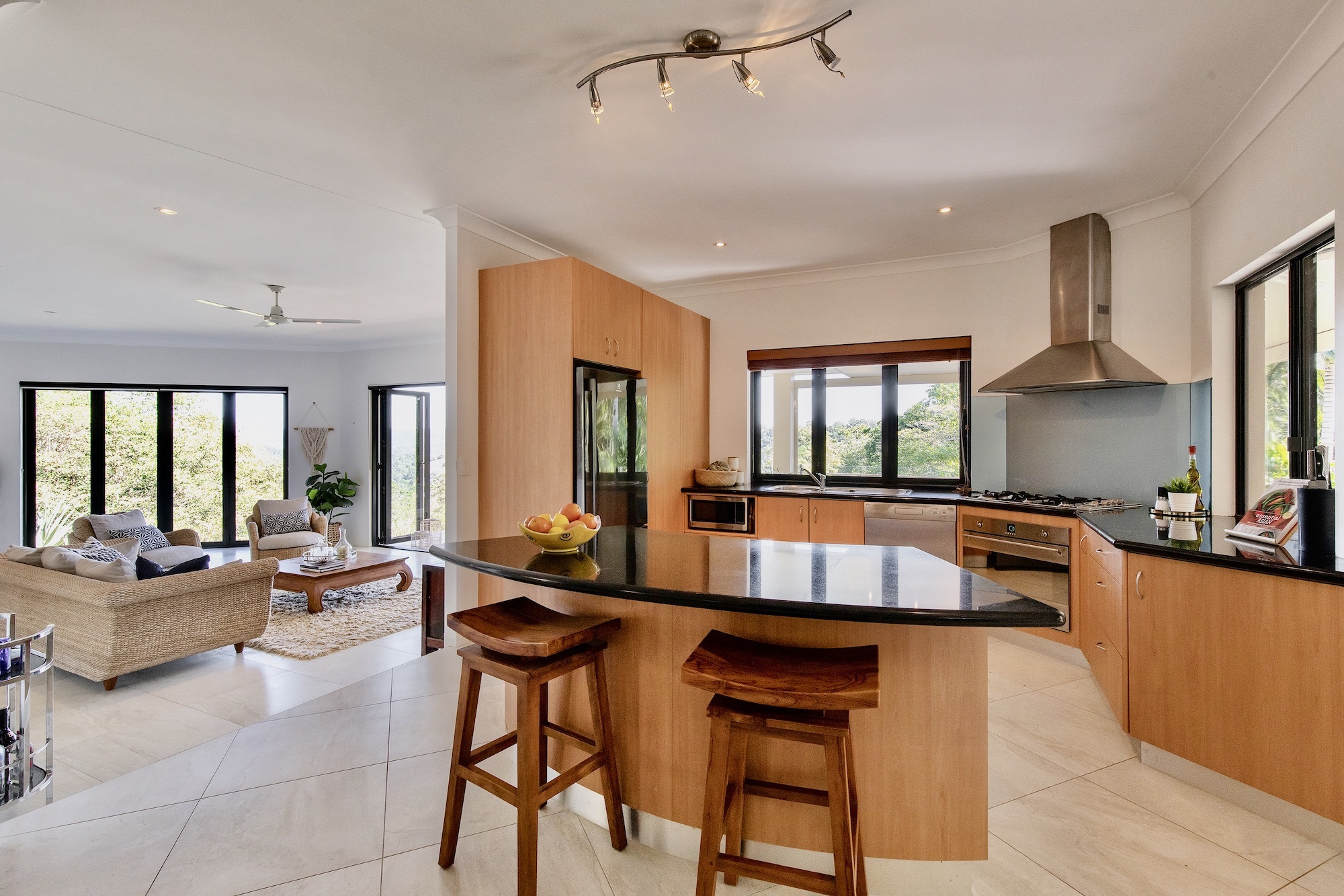 • Woodgrain & stainless steel kitchen with contrasting granite benchtops