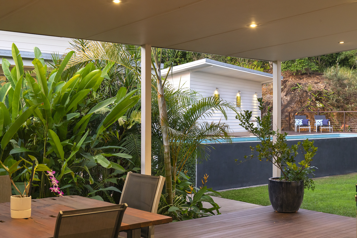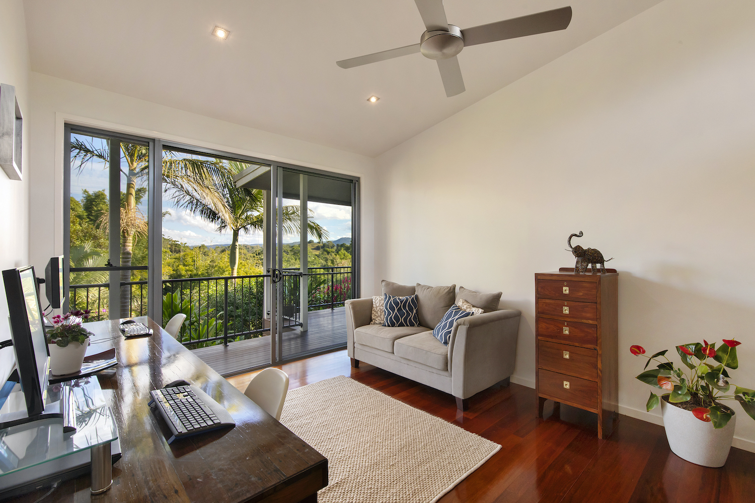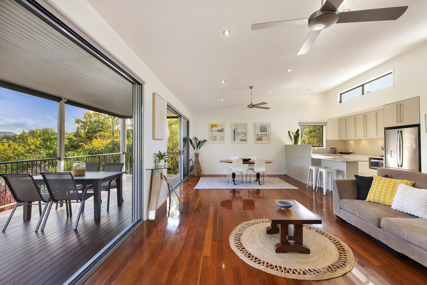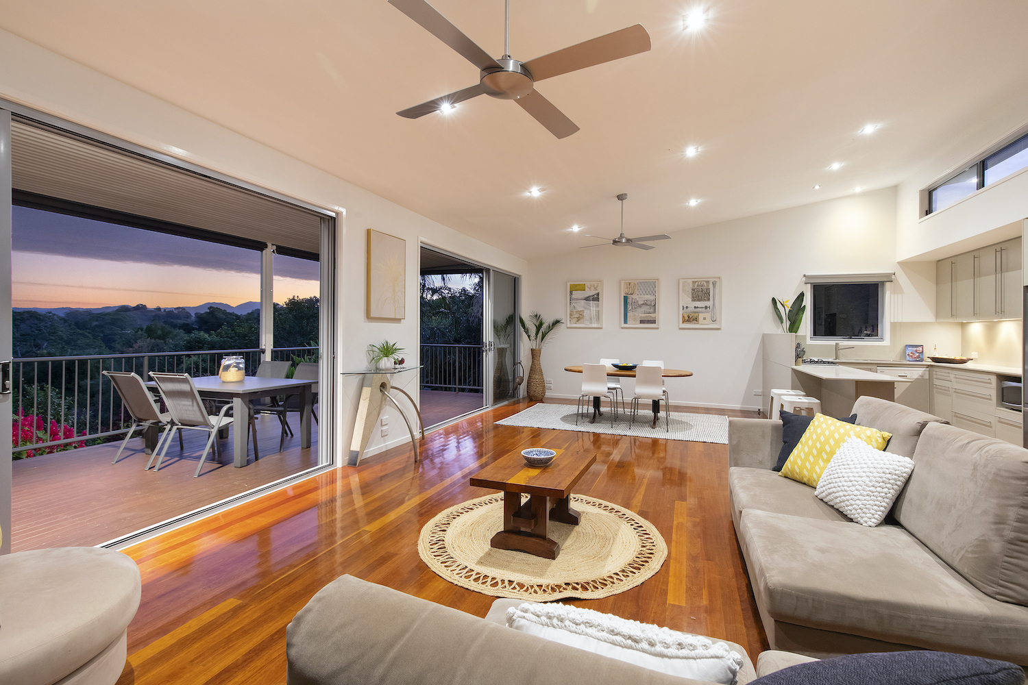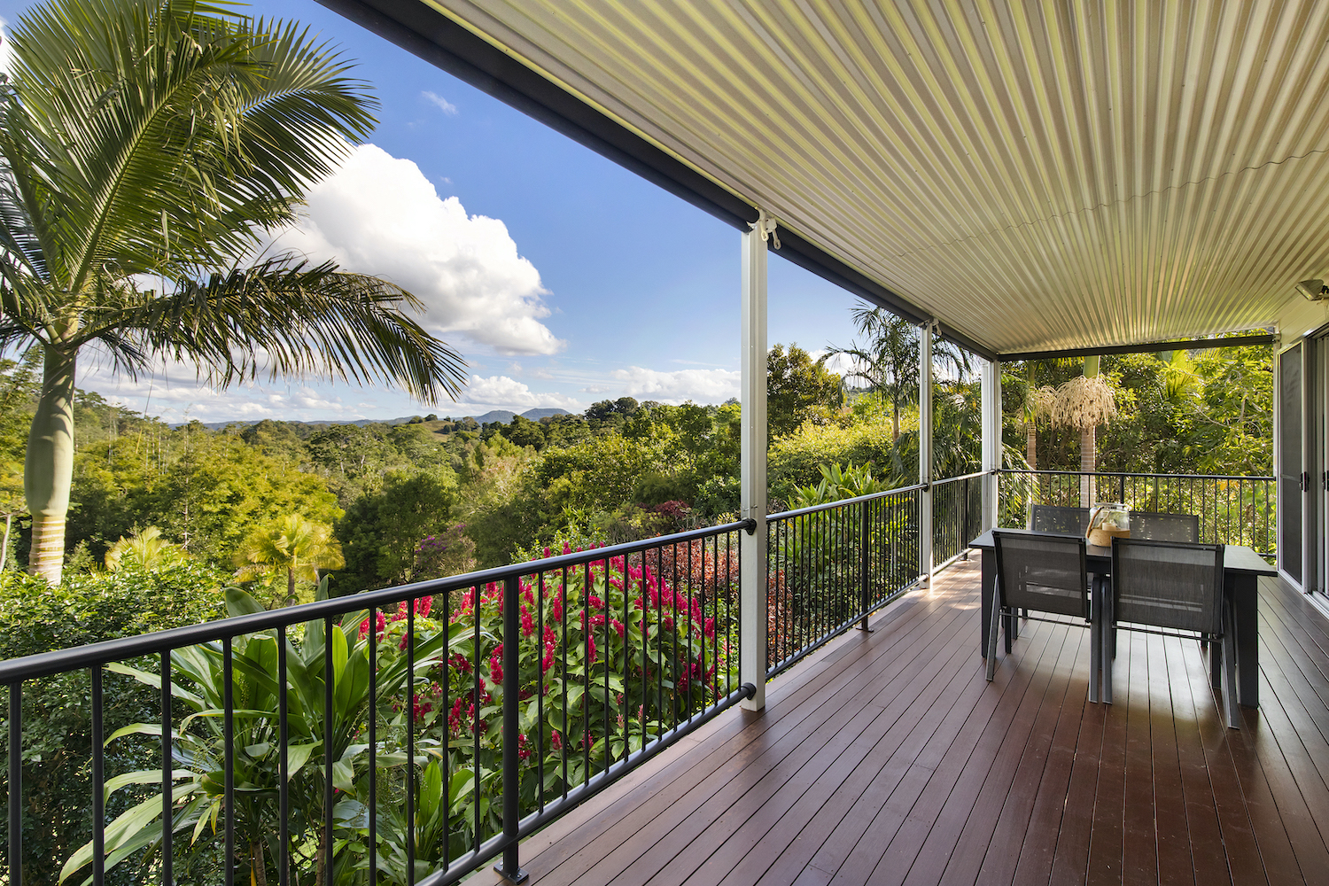 Enjoy the peace and seclusion of this well designed pavilion style home. Built to take advantage of the panoramic views, natural light and prevailing breezes. With soaring ceilings, Blue Gum floors and open plan layout, this home flows naturally to full length alfresco decks and a central interior courtyard deck surrounding a lush tropical garden, ideal for secluded undercover entertaining, whatever the weather.