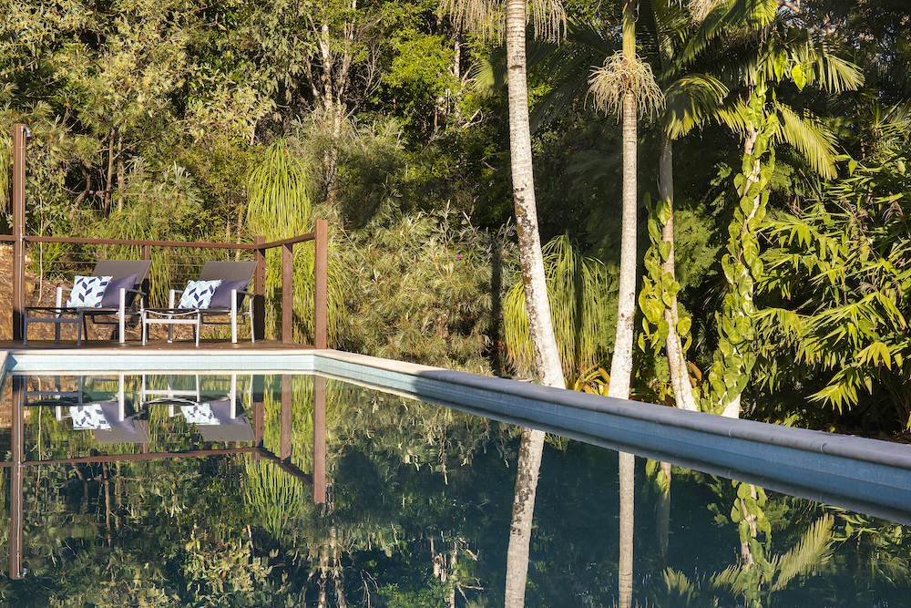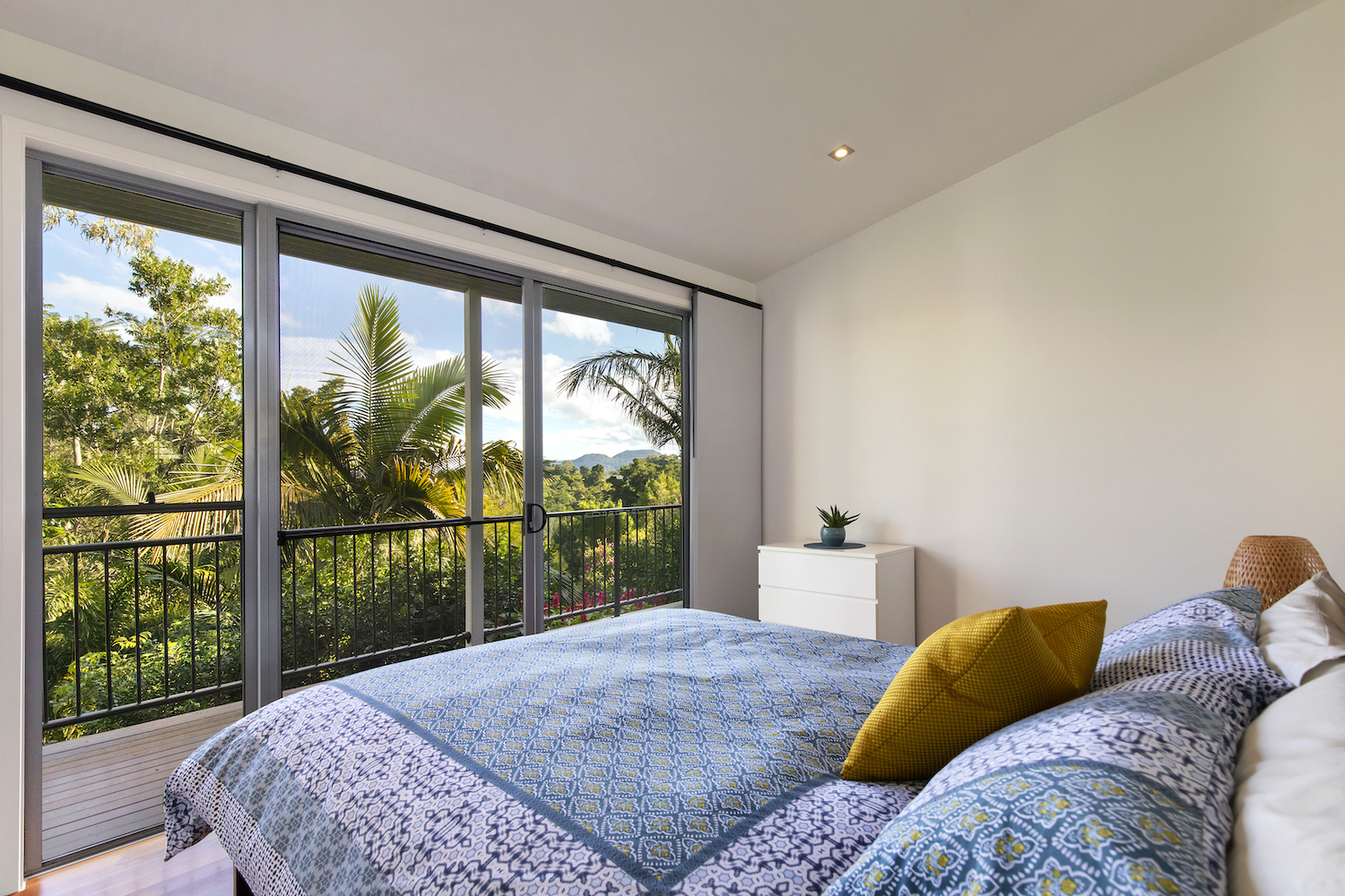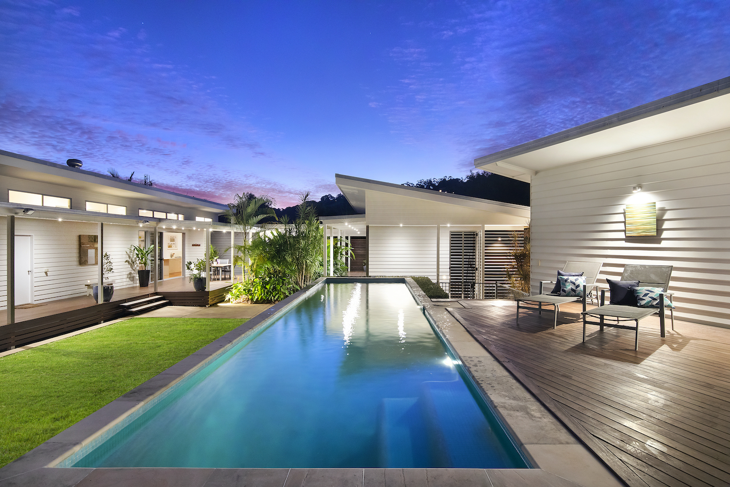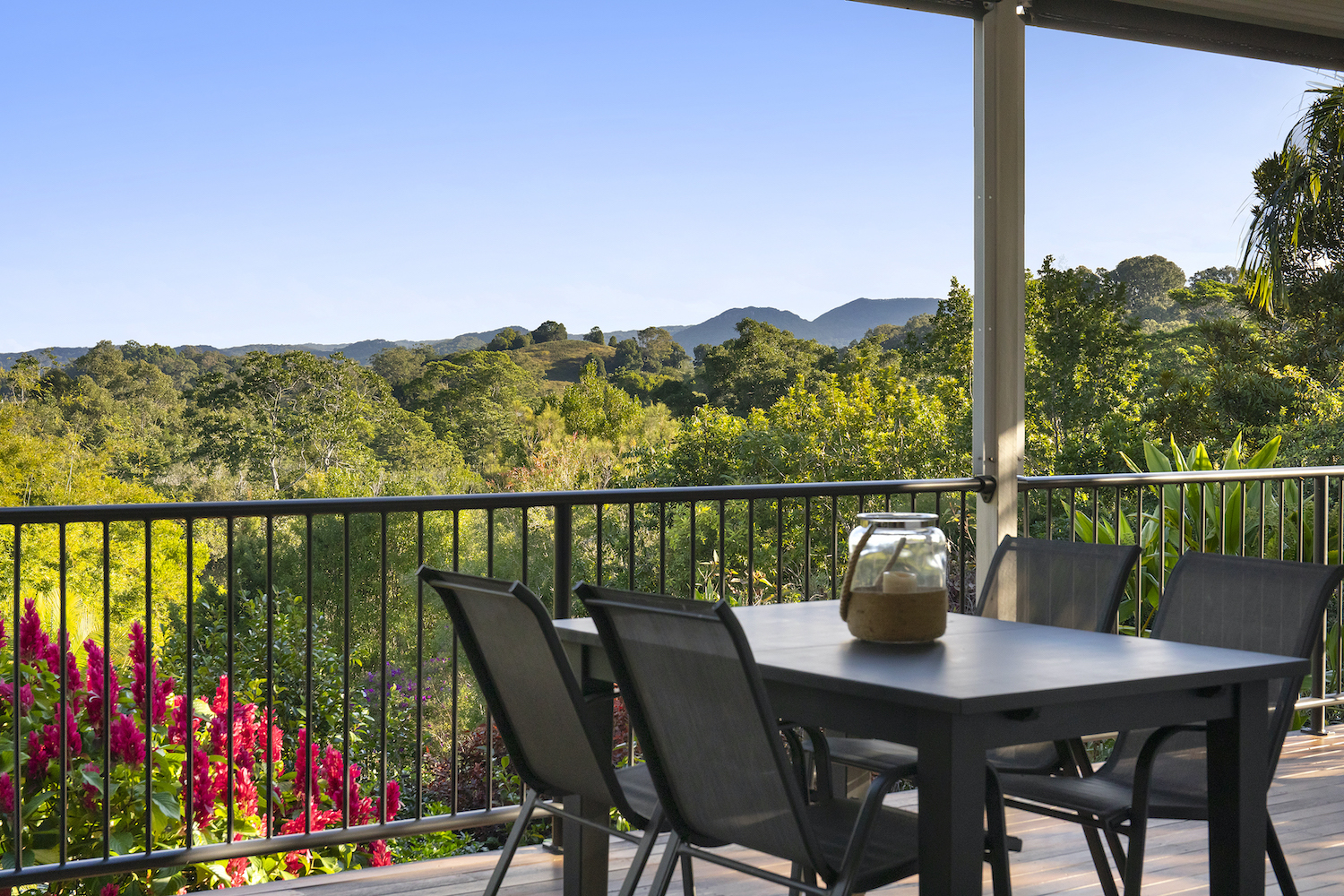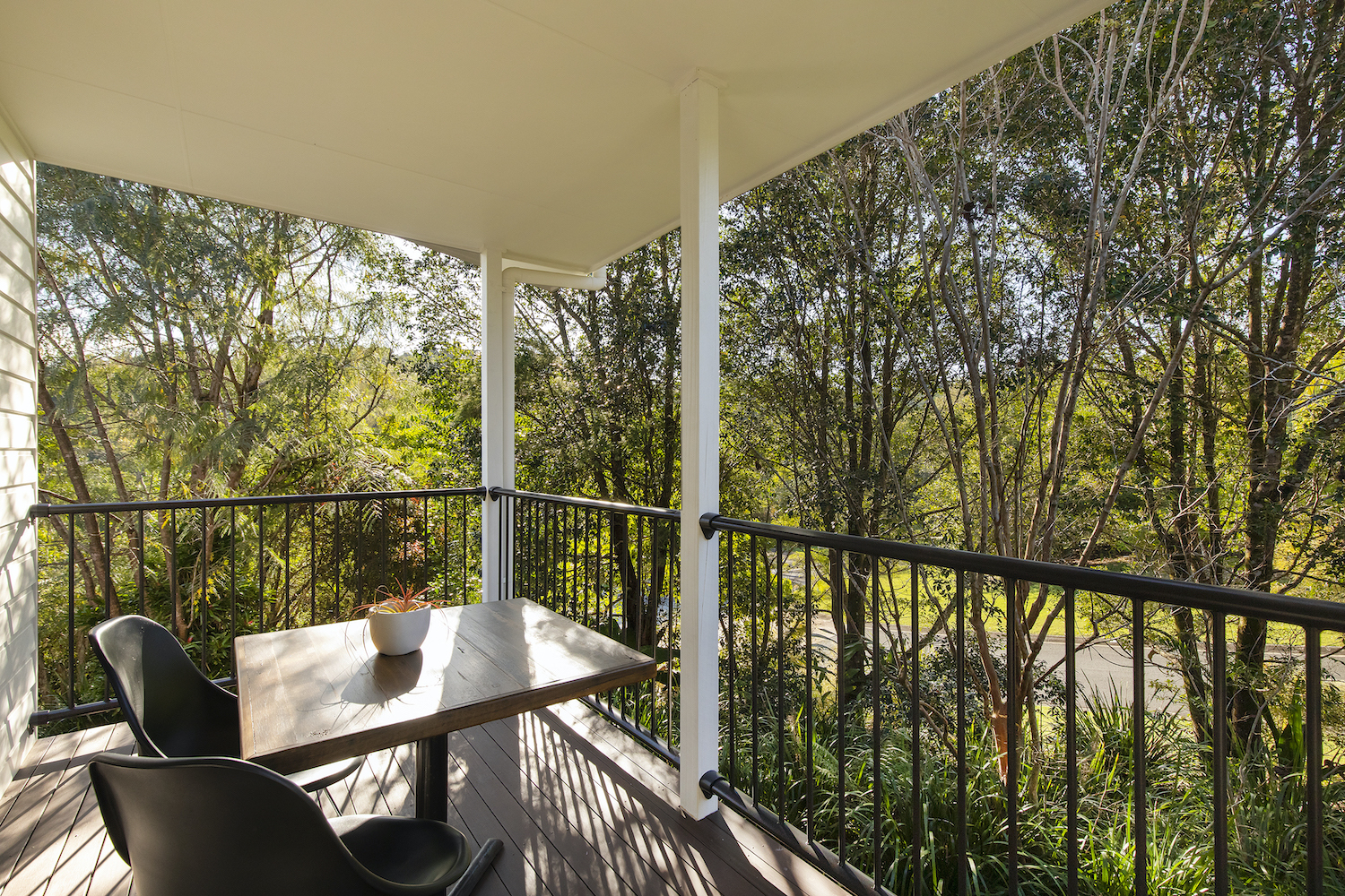 The main pavilion offers two king bedrooms and spacious living opening to undercover decks with 180 degree lush hinterland views across to Mt Eerwah. The second pavilion features two bedrooms each with their own private ensuite and balcony with option for separate entrance, cleverly linked to the main pavilion via wide verandahs overlooking the interior courtyard.