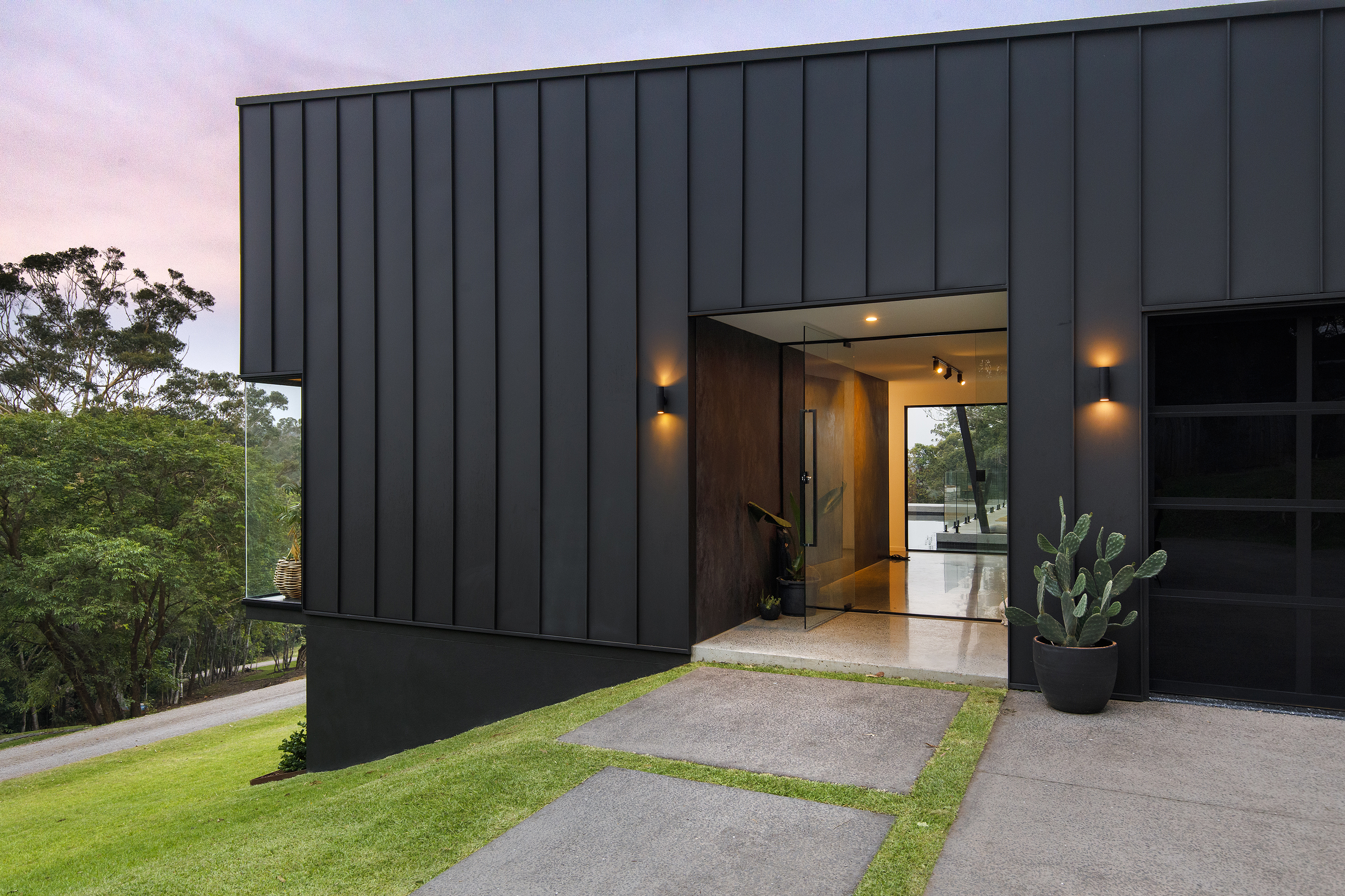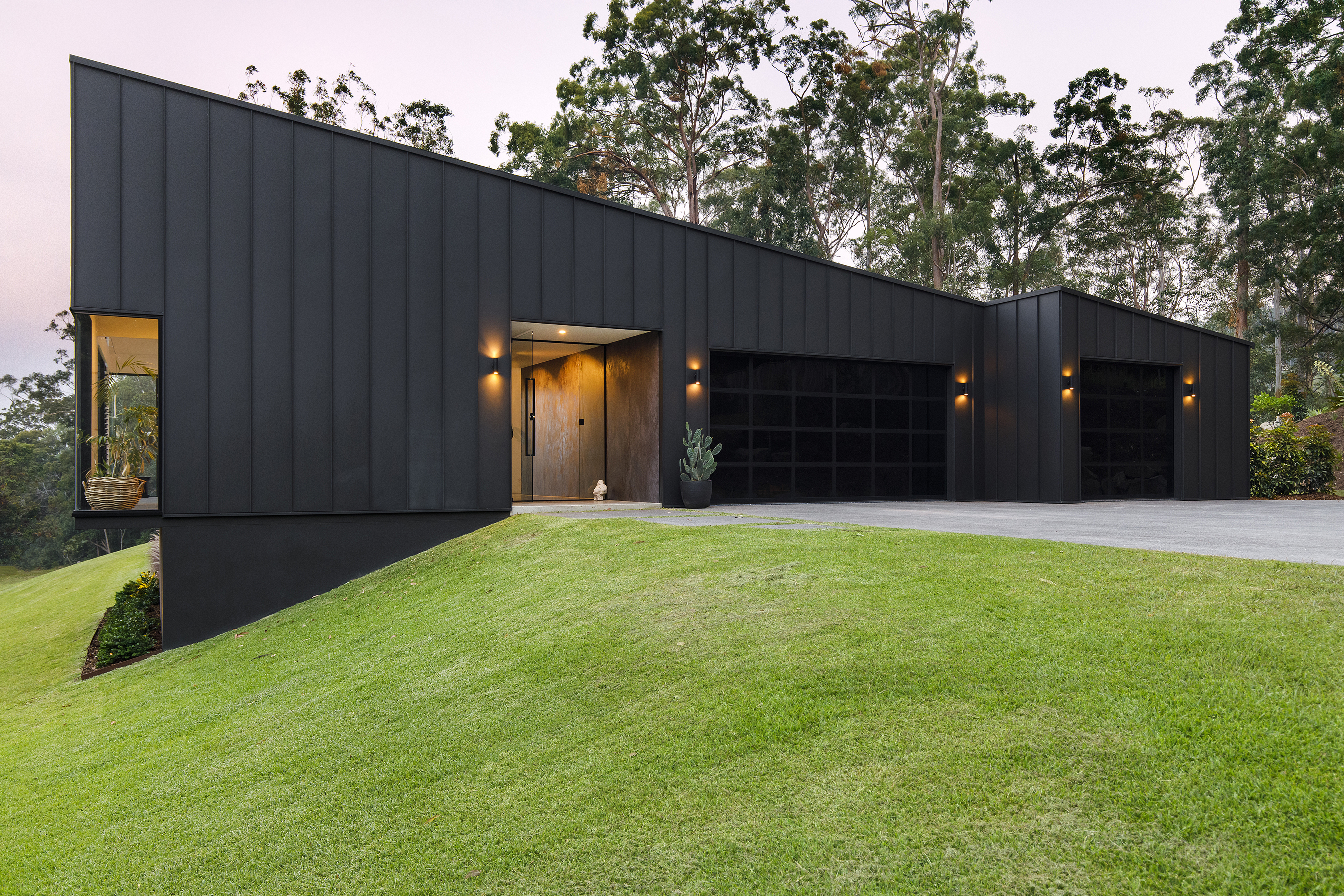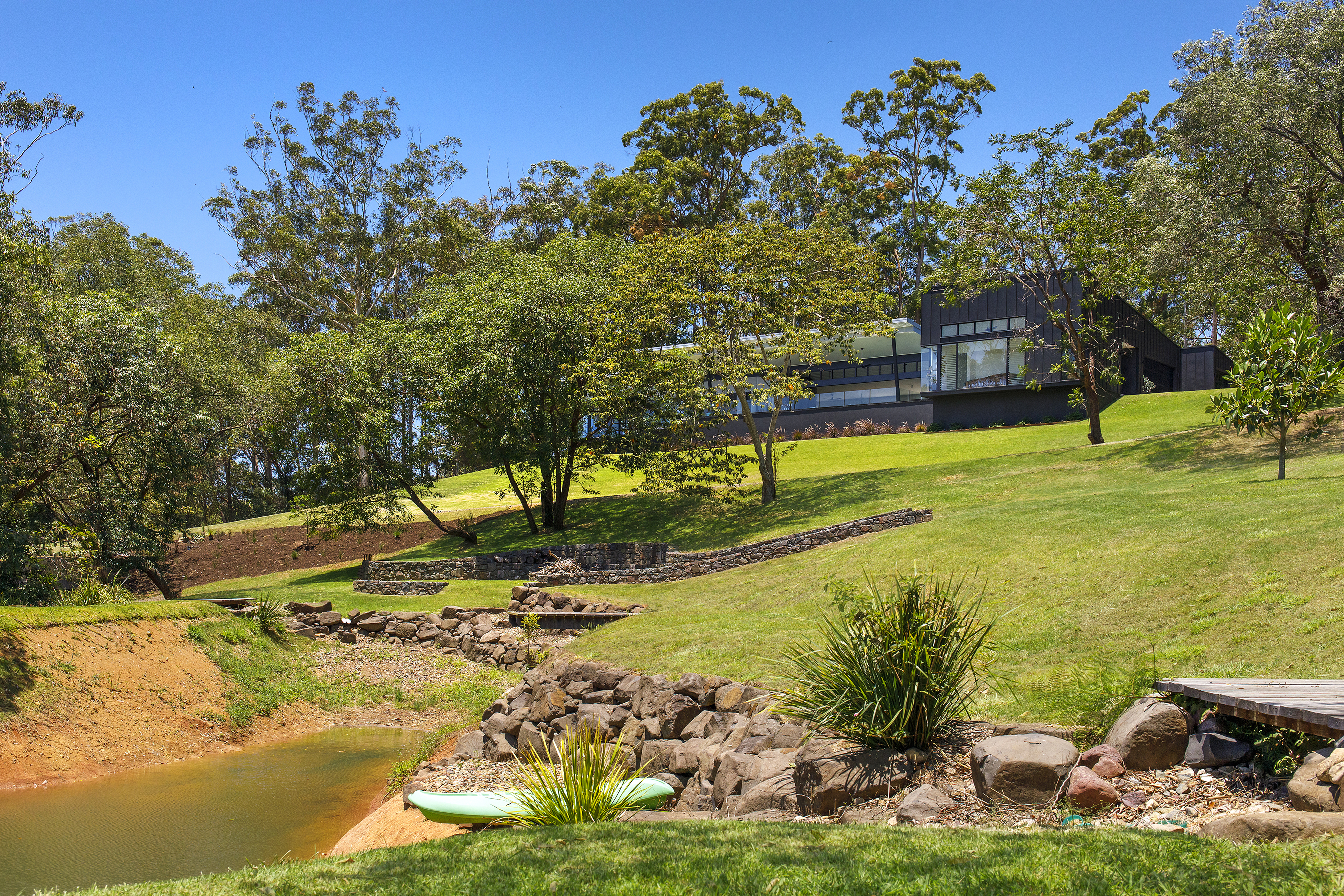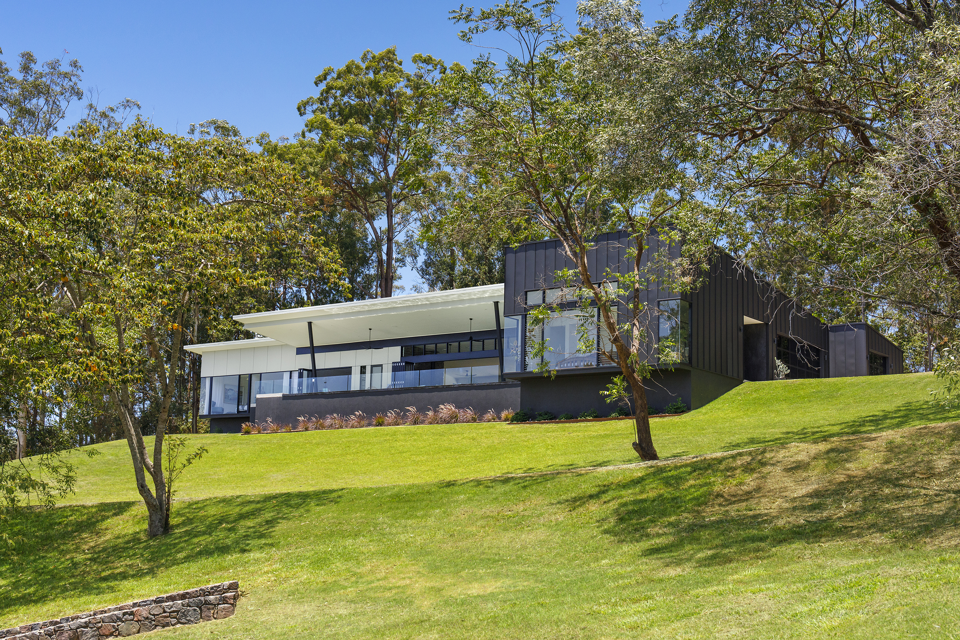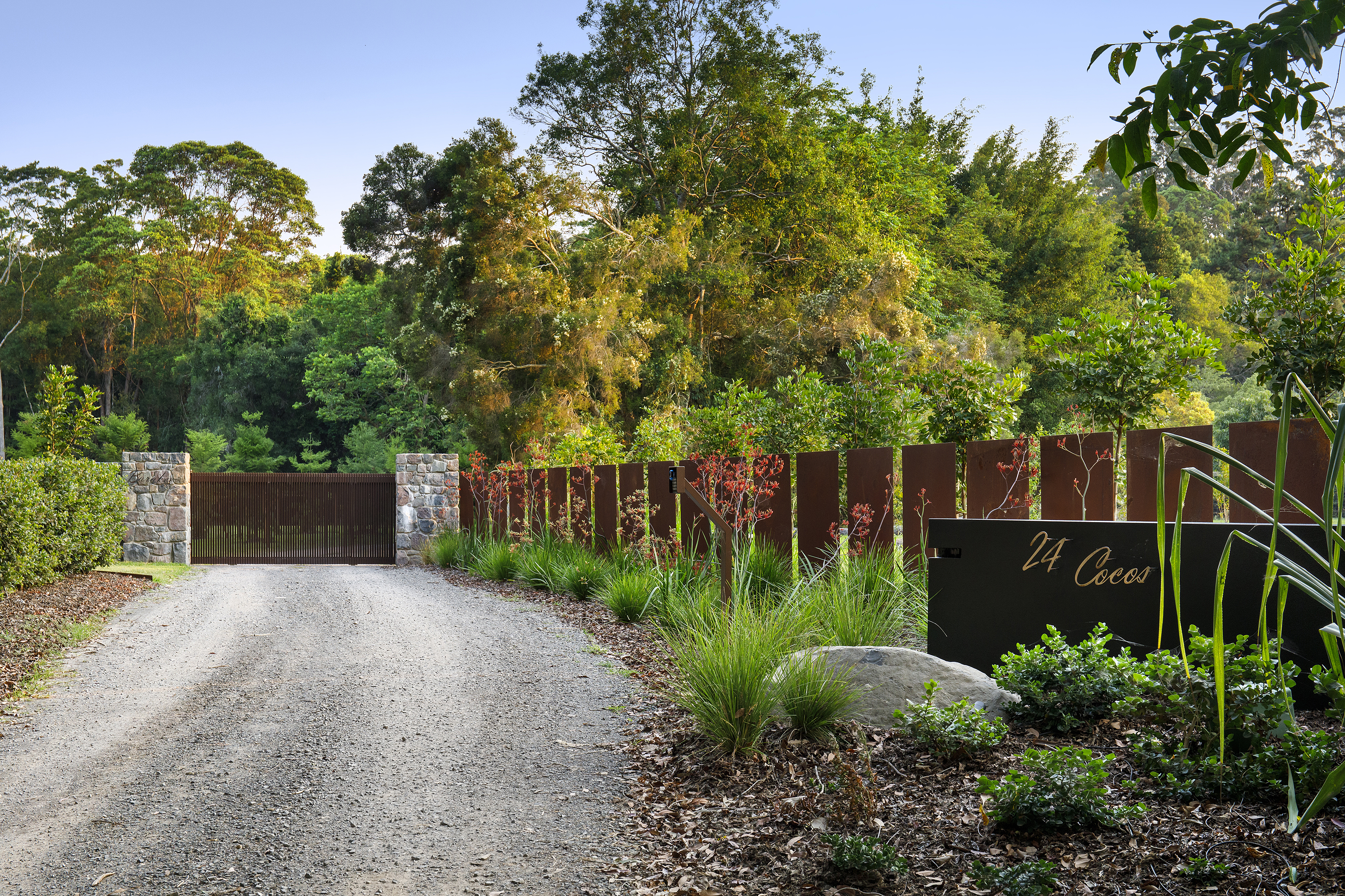 As you pass the modern gated entry, a meandering road takes you past green paddocks, down and over a natural creek, through rainforest, then up through beautifully placed trees, as the masterpiece comes into view.