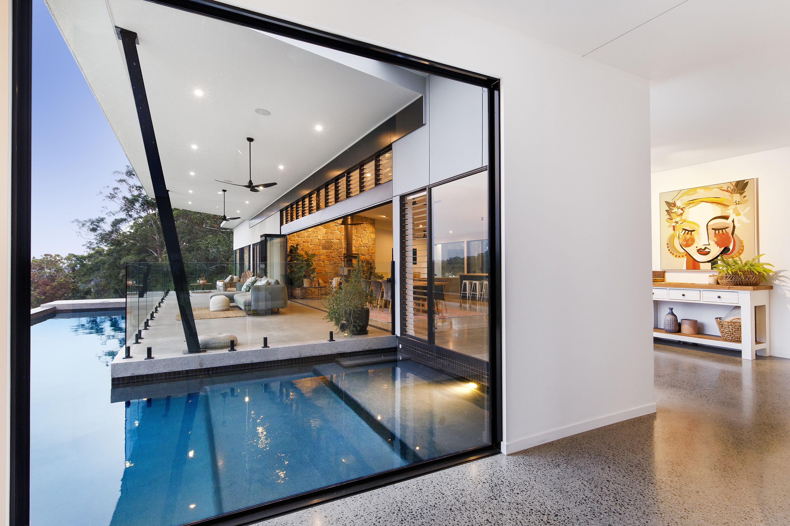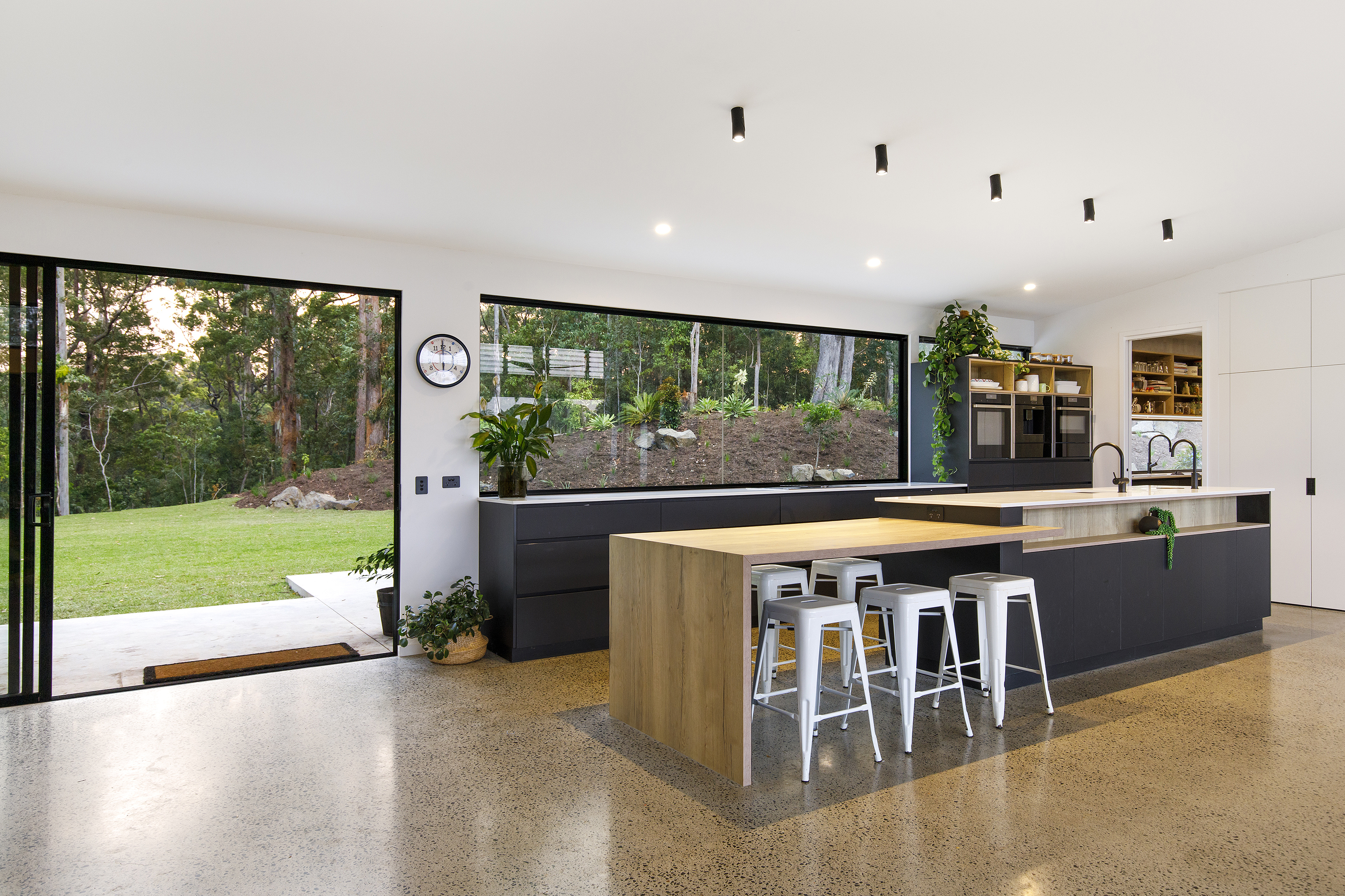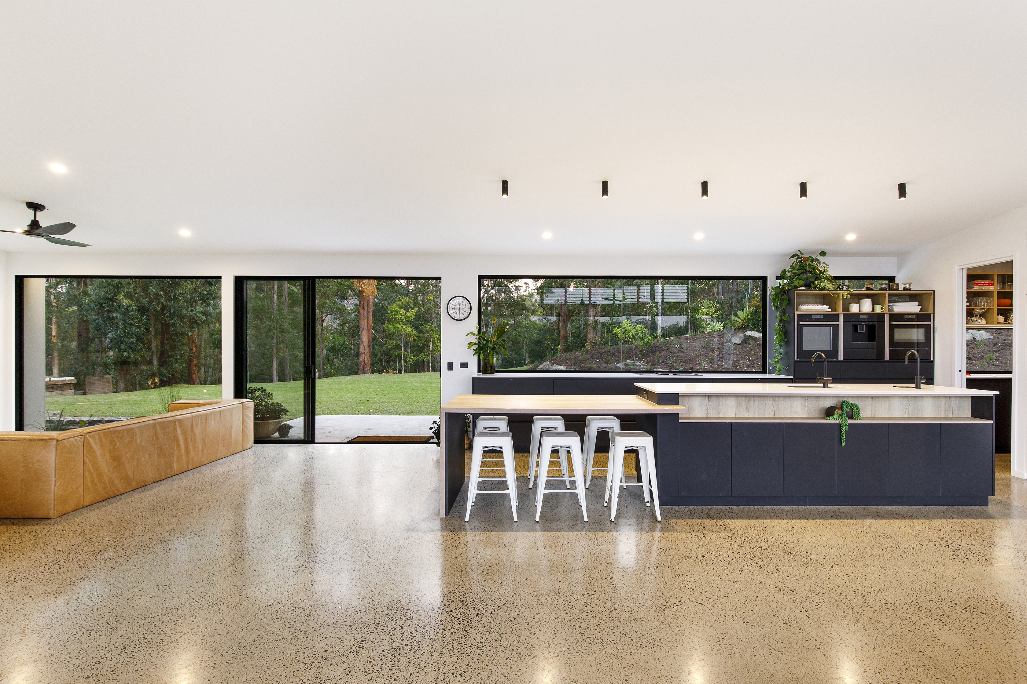 Arriving up to the black clad wing at one end of the home, the entrance gives a tease of what’s to come. Through the frameless all glass pivoting door, polished concrete floors and grey Italian porcelain tiles lead you to floor to ceiling windows taking in the L shaped pool and the bush beyond.