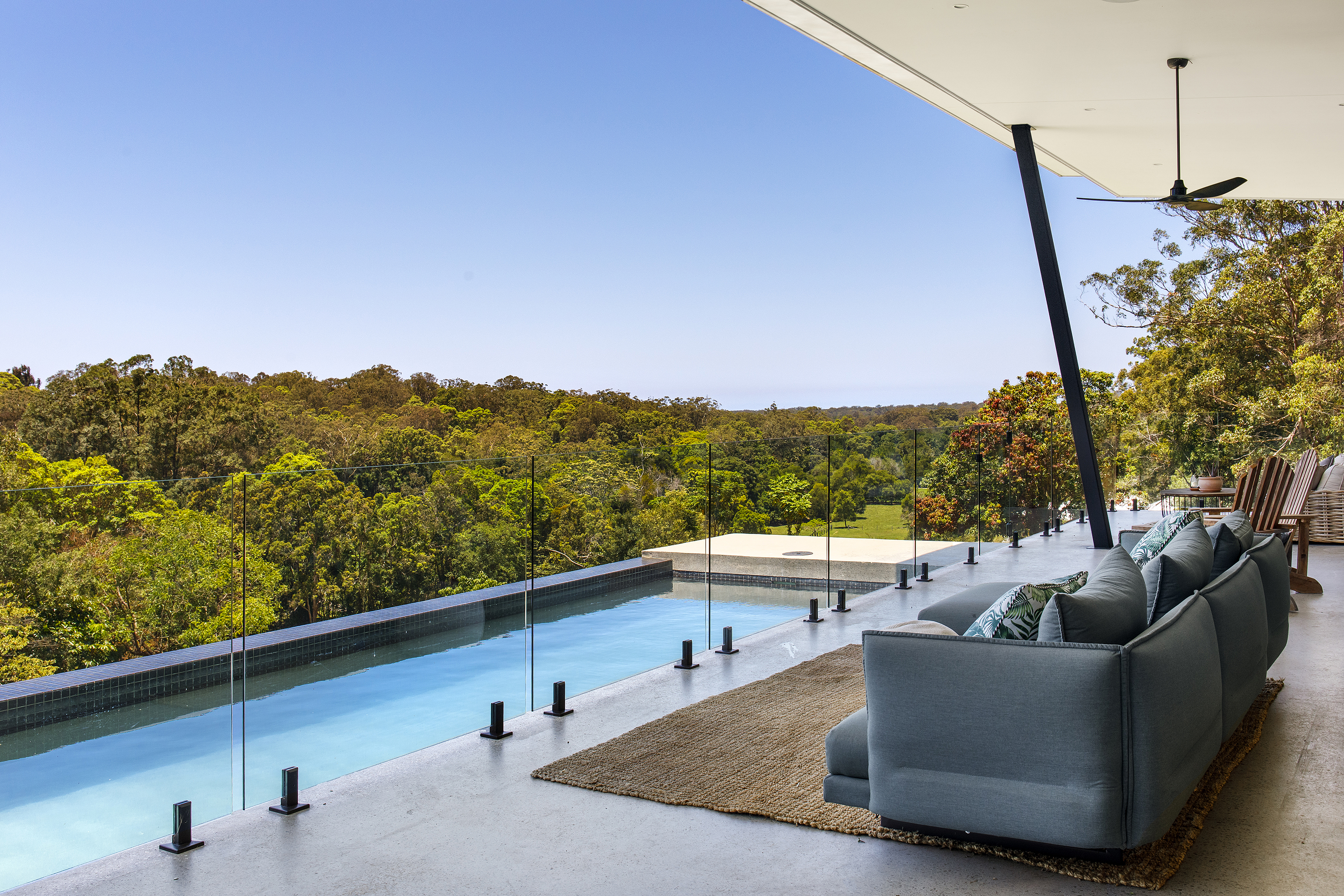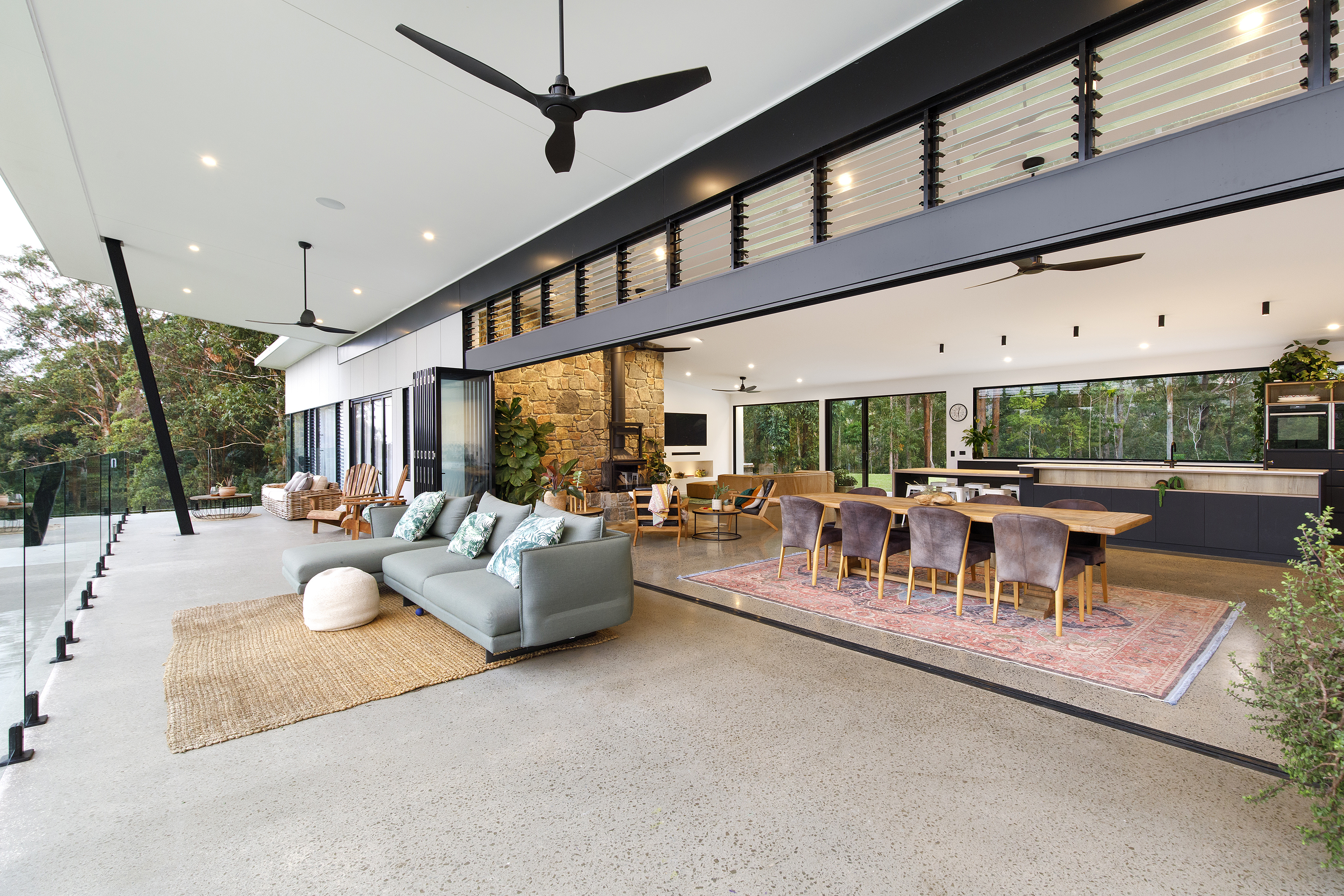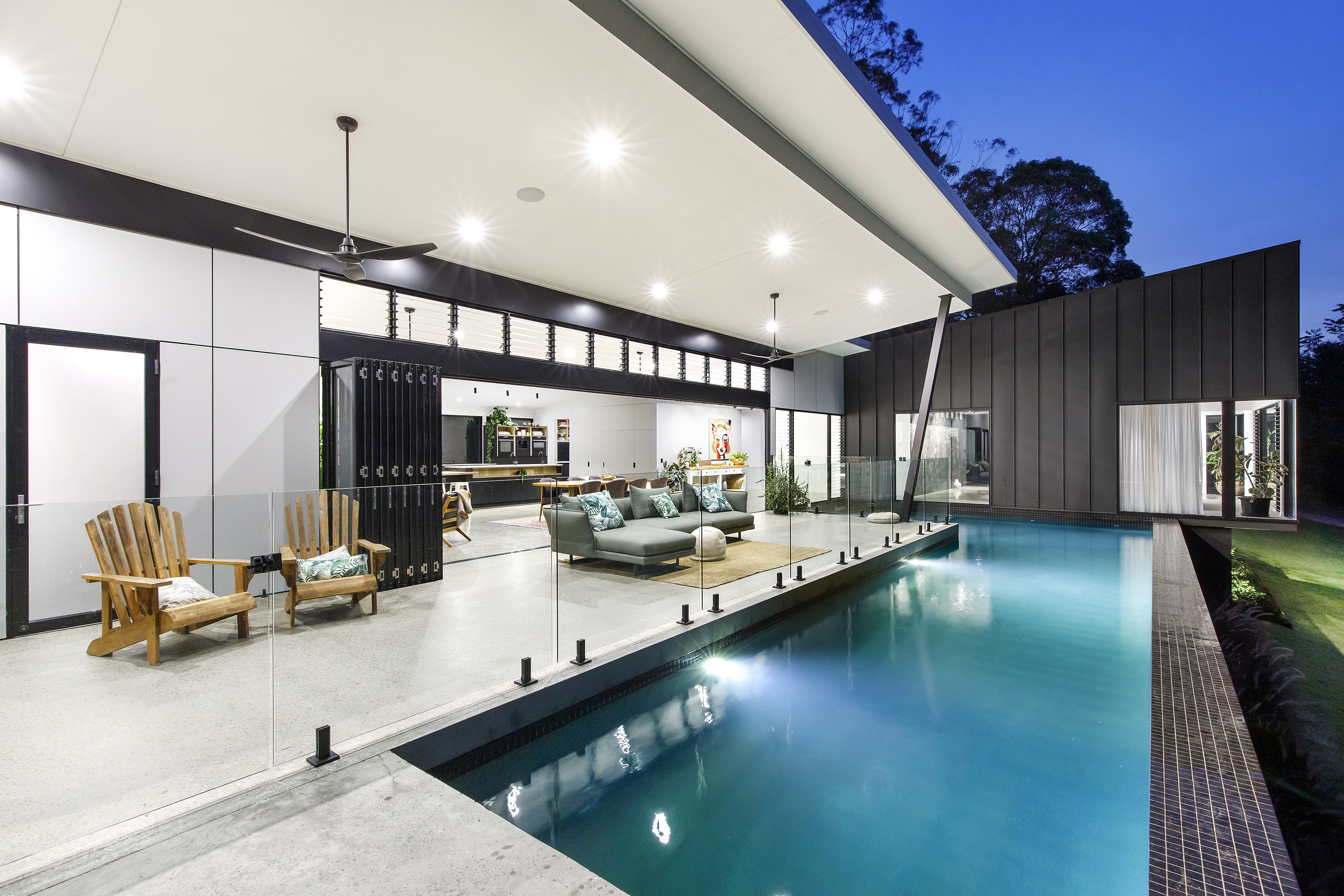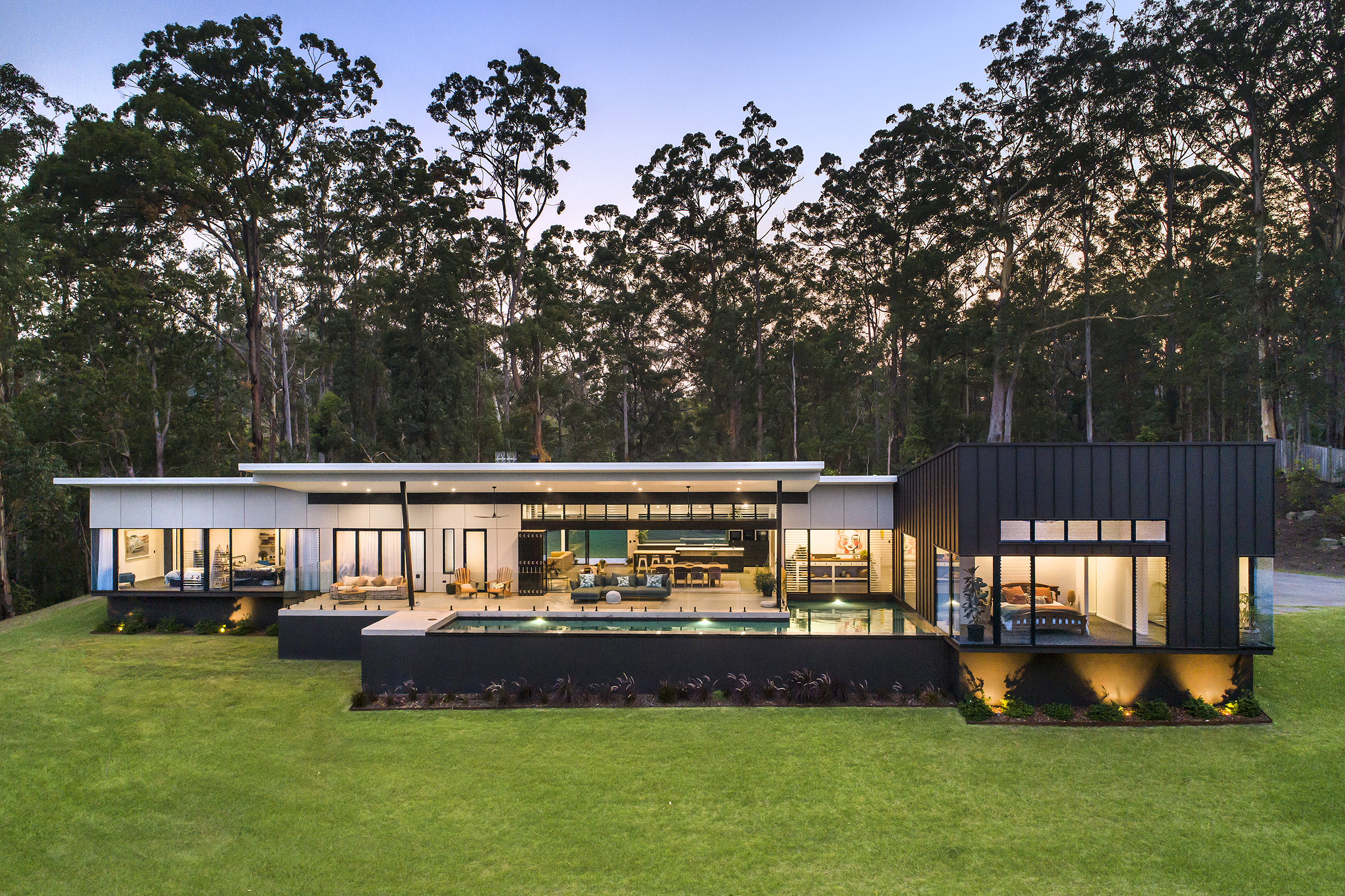 Arriving up to the black clad wing at one end of the home, the entrance gives a tease of what’s to come. Through the frameless all glass pivoting door, polished concrete floors and grey Italian porcelain tiles lead you to floor to ceiling windows taking in the L shaped pool and the bush beyond.