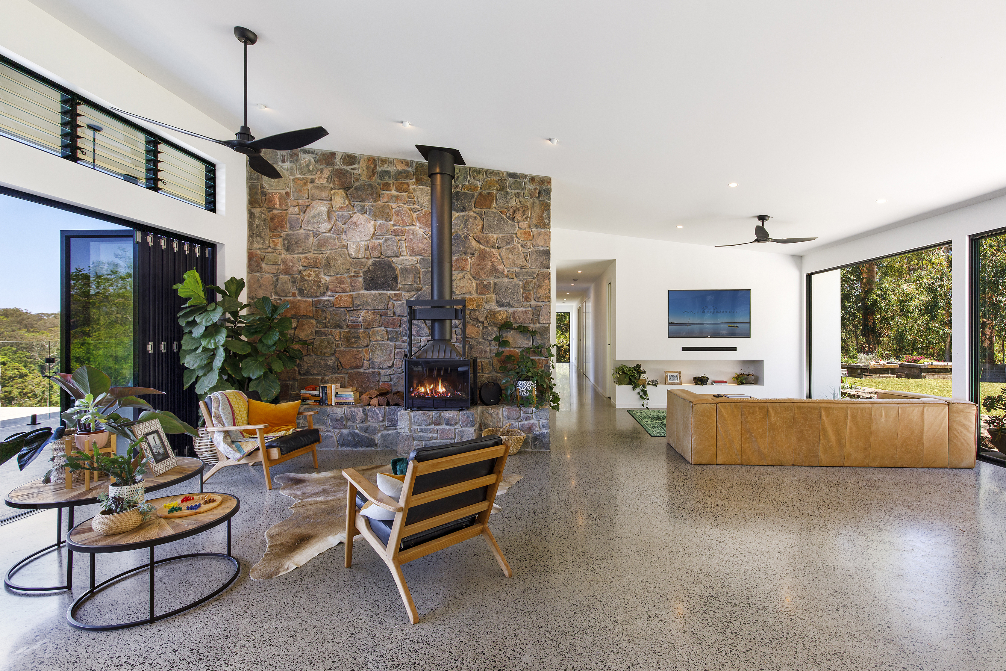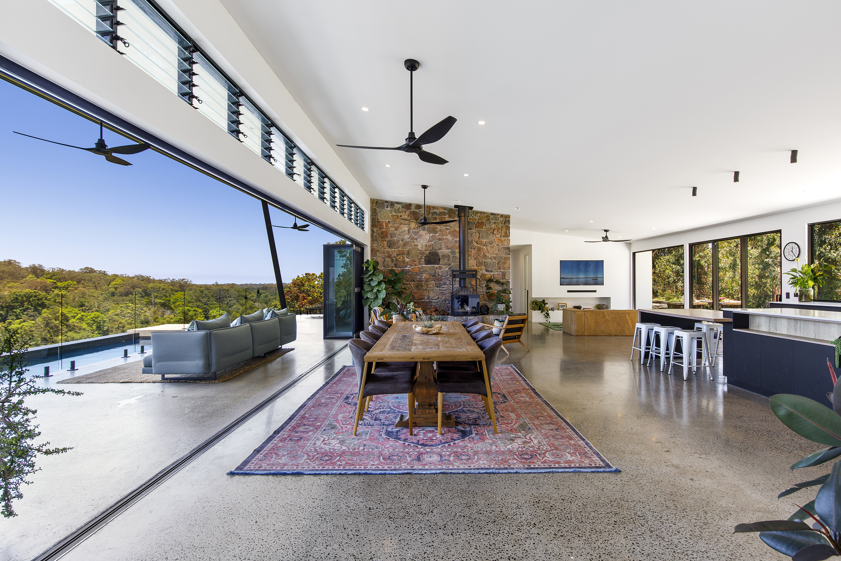 The open plan lounge and dining comes with built in television and sound bar and home BOSE system servicing inside and out. A stunning stone wall with fireplace grounds the living space and firmly states that this is a home. Cross ventilation and views of the bush bring natural air and light.