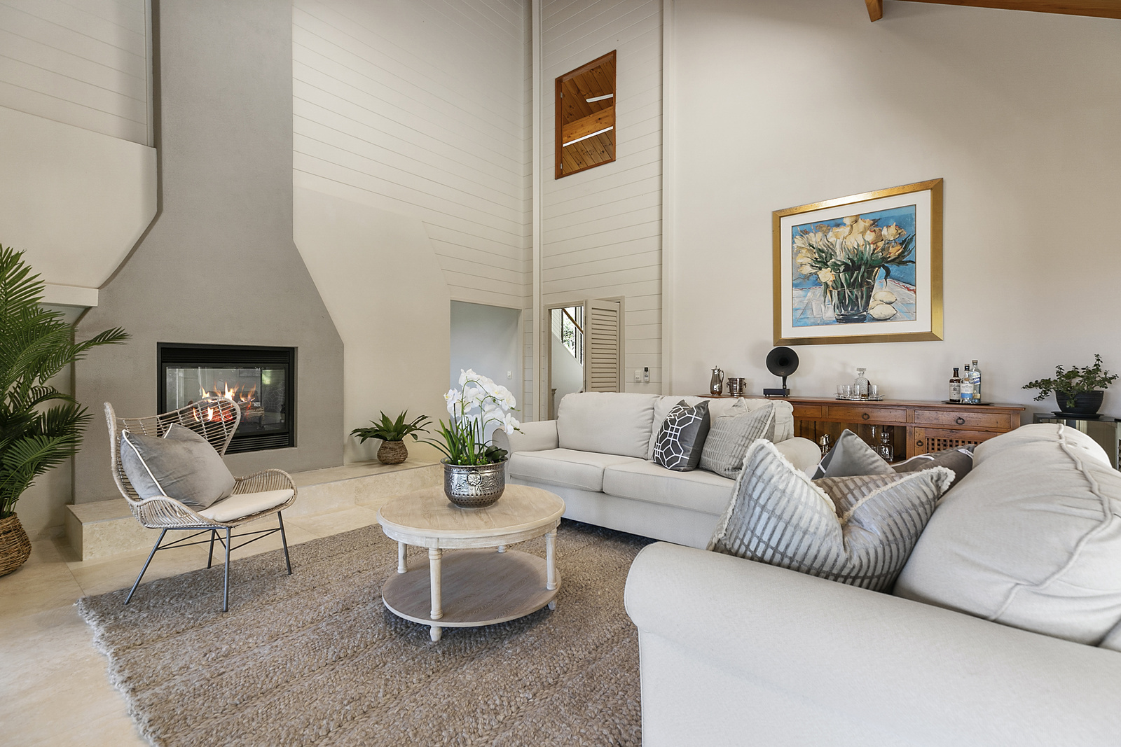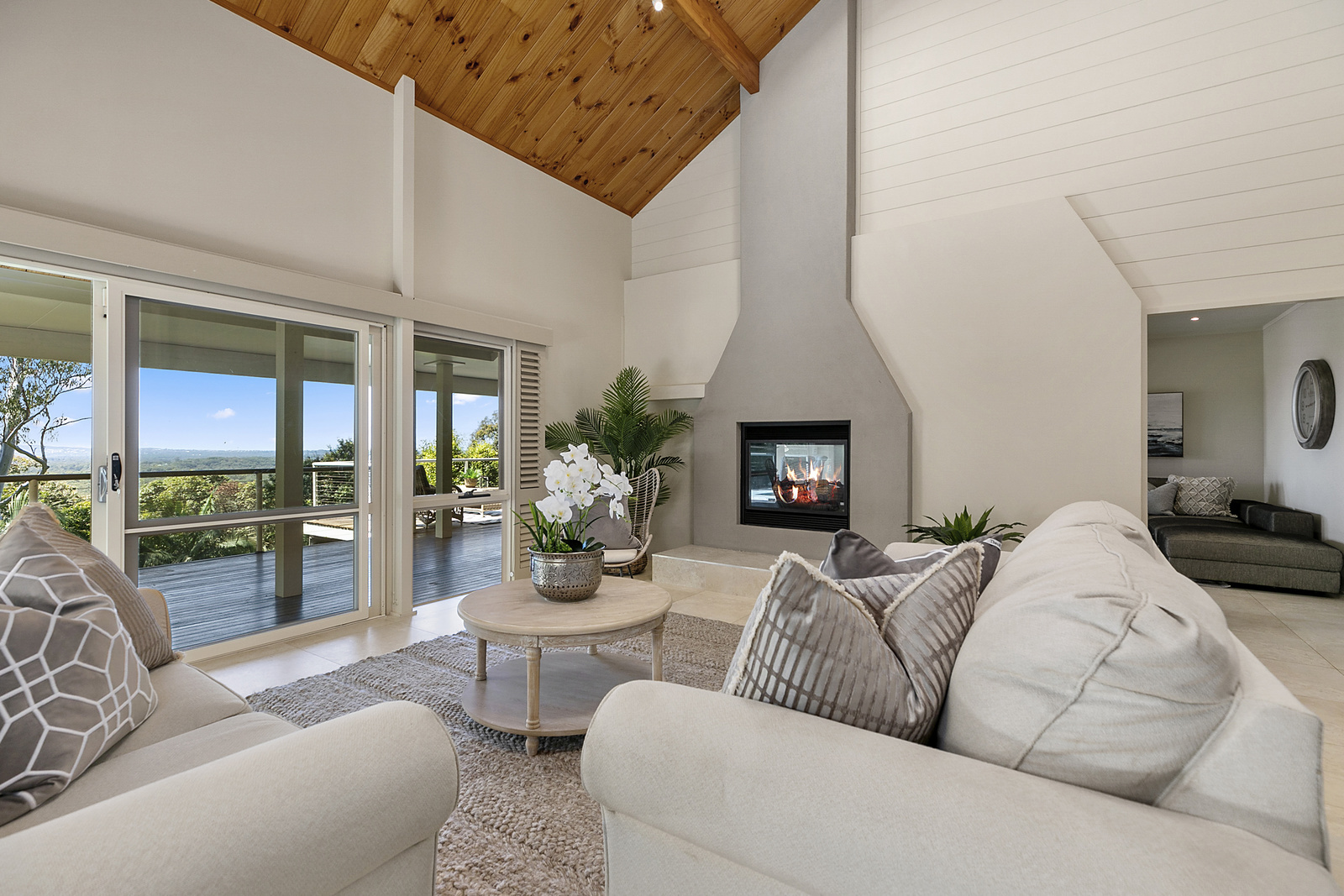 Entering from the forecourt, the soaring vaulted ceilings come in to view, this is the middle level of the home and hosts a large open living and dining area with double sided fireplace, and an entertainers kitchen with island bench. Off these areas, an enormous wrap around decks leads to a beautiful pool and undercover entertaining area with barbeque and wine fridges. From every angle, the views are magnificent.