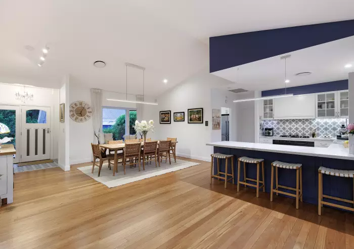 — Polished blackbutt timber flooring throughout kitchen, lounge and dining areas