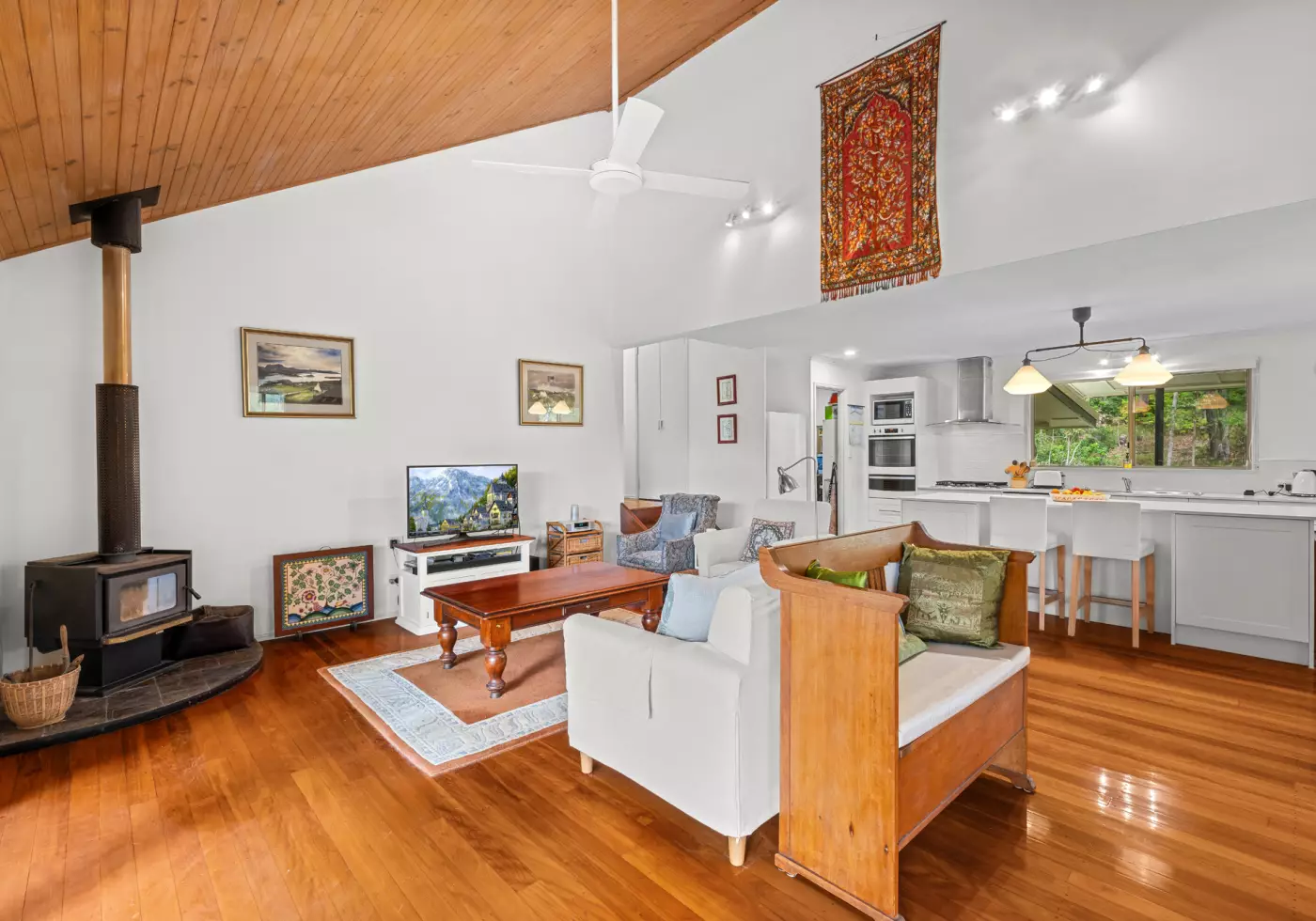 This solid hardwood pole home has a certain romance and features lovely timber floors in the living areas.