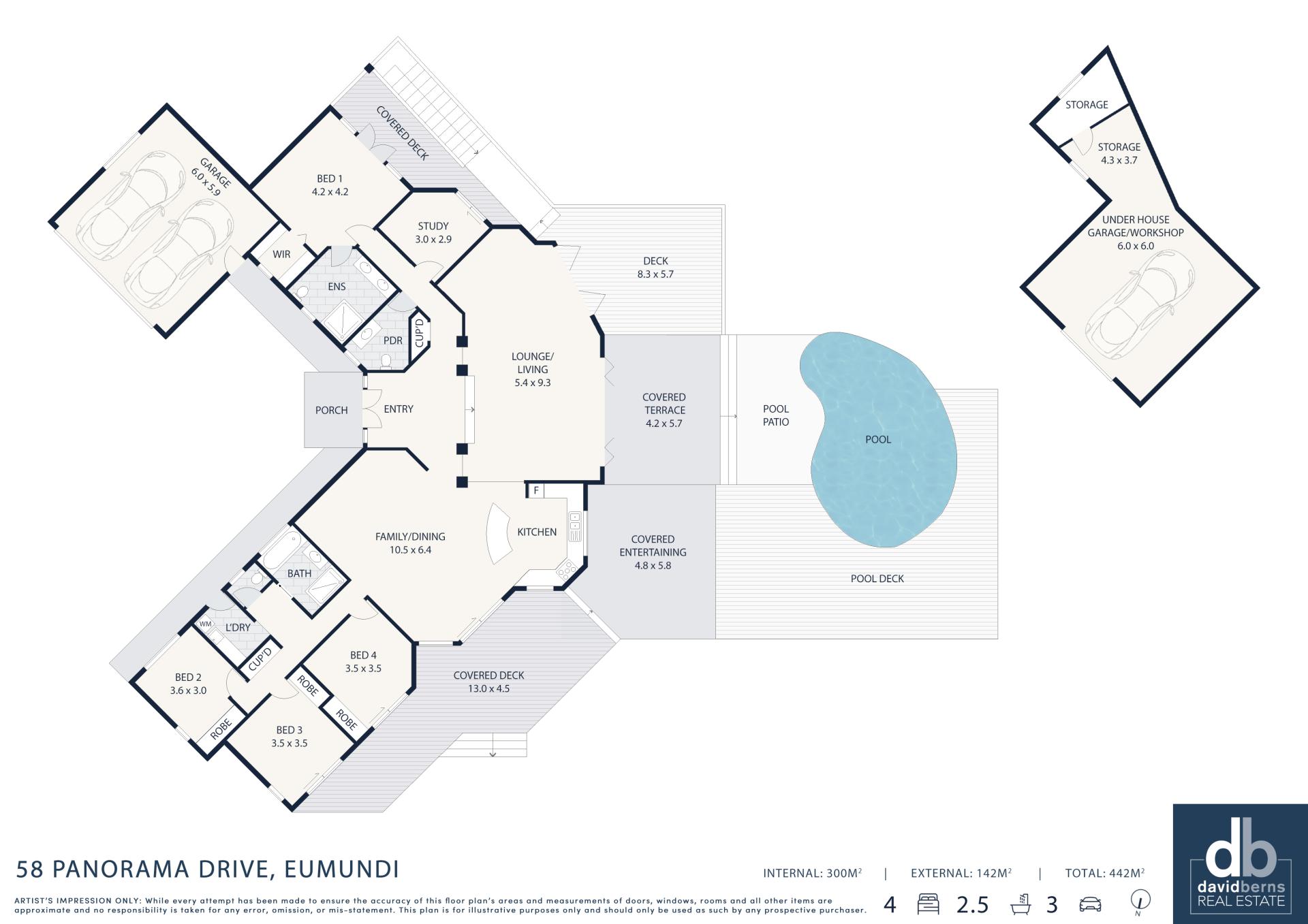 Outdoors, the pool is perfectly positioned to soak in long afternoons and golden sunsets across the valley. Beneath the home, a generous workshop offers valuable storage or workspace, complemented by a double garage and additional secure parking for two vehicles within the gated entry.